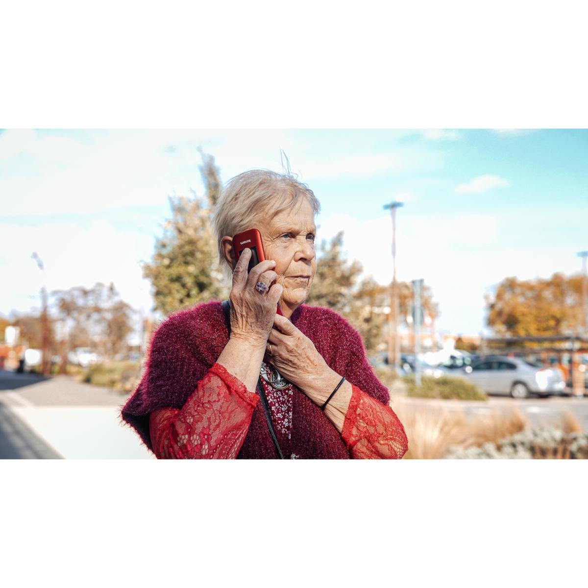 | Plus produit | Téléphone mobile pour sénior à clapet X3. Couleur(s) : rouge ou noir. Réseau : 4G. Écrans : double LCD, 2,8" et 1,77". Touches larges avec caractères de grande taille. Appareil photo : 2MP. Batterie : 1400 mAh. Autonomie : 120h en veille, 3h en communication. Connectivité : Nano SIM, micro SD, USB-C. Fonctionnalités : GPS, bouton SOS, téléassistance. Accessoires : dock de recharge inclus |
