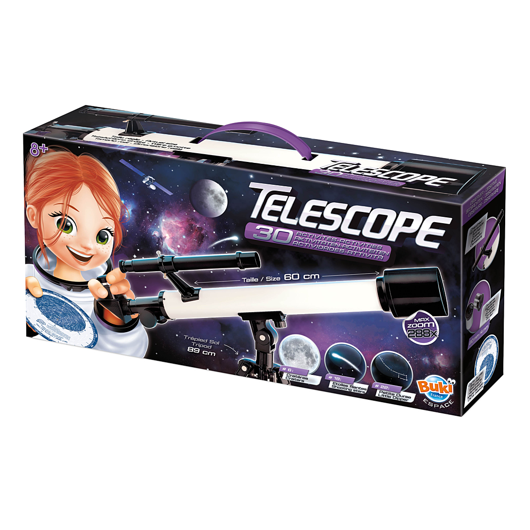 Un télescope avec une notice de 30 activités pour découvrir le ciel étoilé, les planètes et le paysage lunaire. Lentille de 50 mm de diamètre et 2 oculaires 20 mm et 4 mm interchangeables. Trépied de sol de 89 cm. Le tube et le trépied sont en métal. Nombreux accessoires inclus : objectif chercheur de 6x25 mm, 1 lentille de Barlow 2.3x, 1 carte du ciel pour se repérer. Notice illustrée en couleurs. Dès 8 ans.
