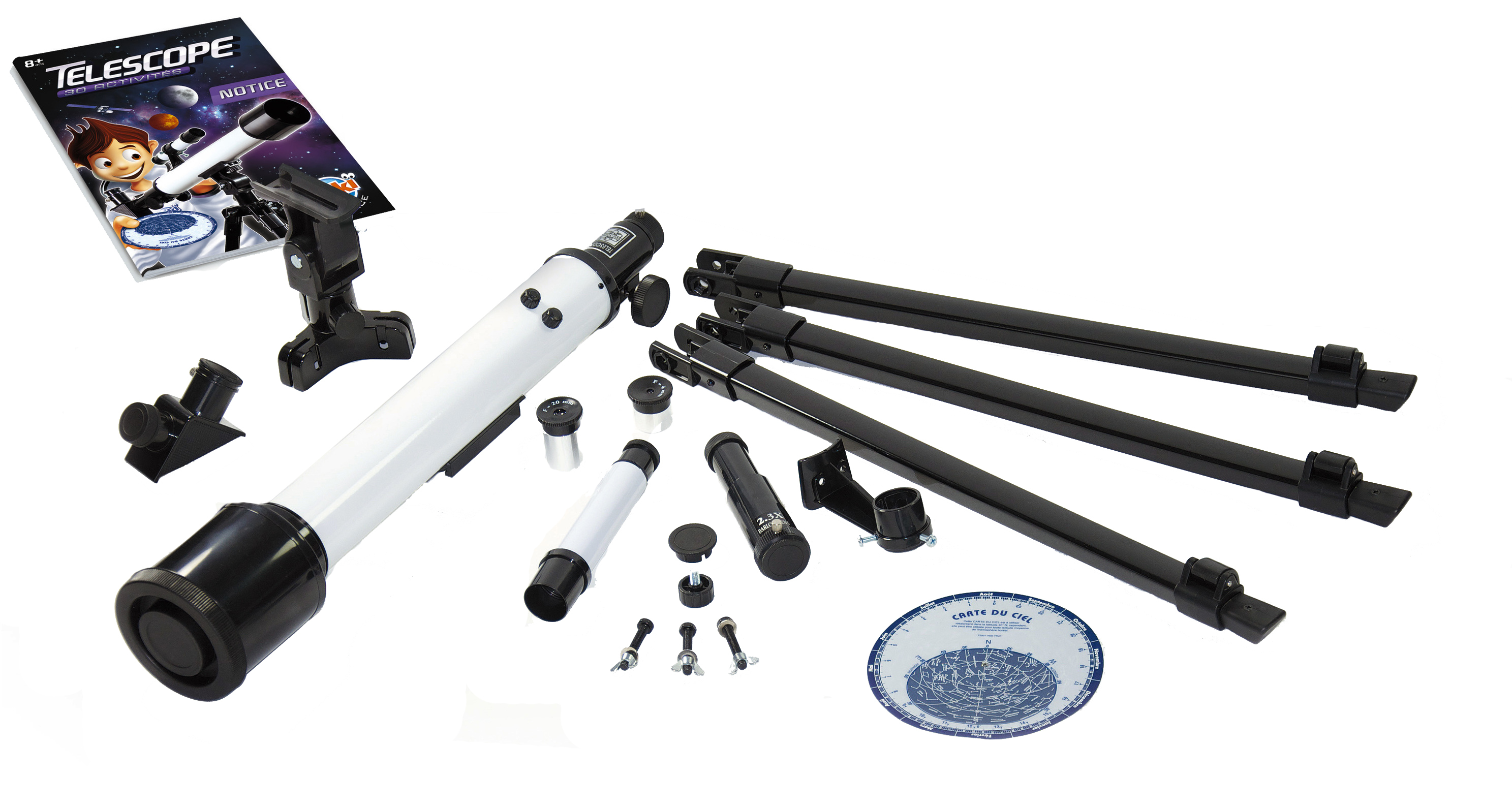 Un télescope avec une notice de 30 activités pour découvrir le ciel étoilé, les planètes et le paysage lunaire. Lentille de 50 mm de diamètre et 2 oculaires 20 mm et 4 mm interchangeables. Trépied de sol de 89 cm. Le tube et le trépied sont en métal. Nombreux accessoires inclus : objectif chercheur de 6x25 mm, 1 lentille de Barlow 2.3x, 1 carte du ciel pour se repérer. Notice illustrée en couleurs. Dès 8 ans.