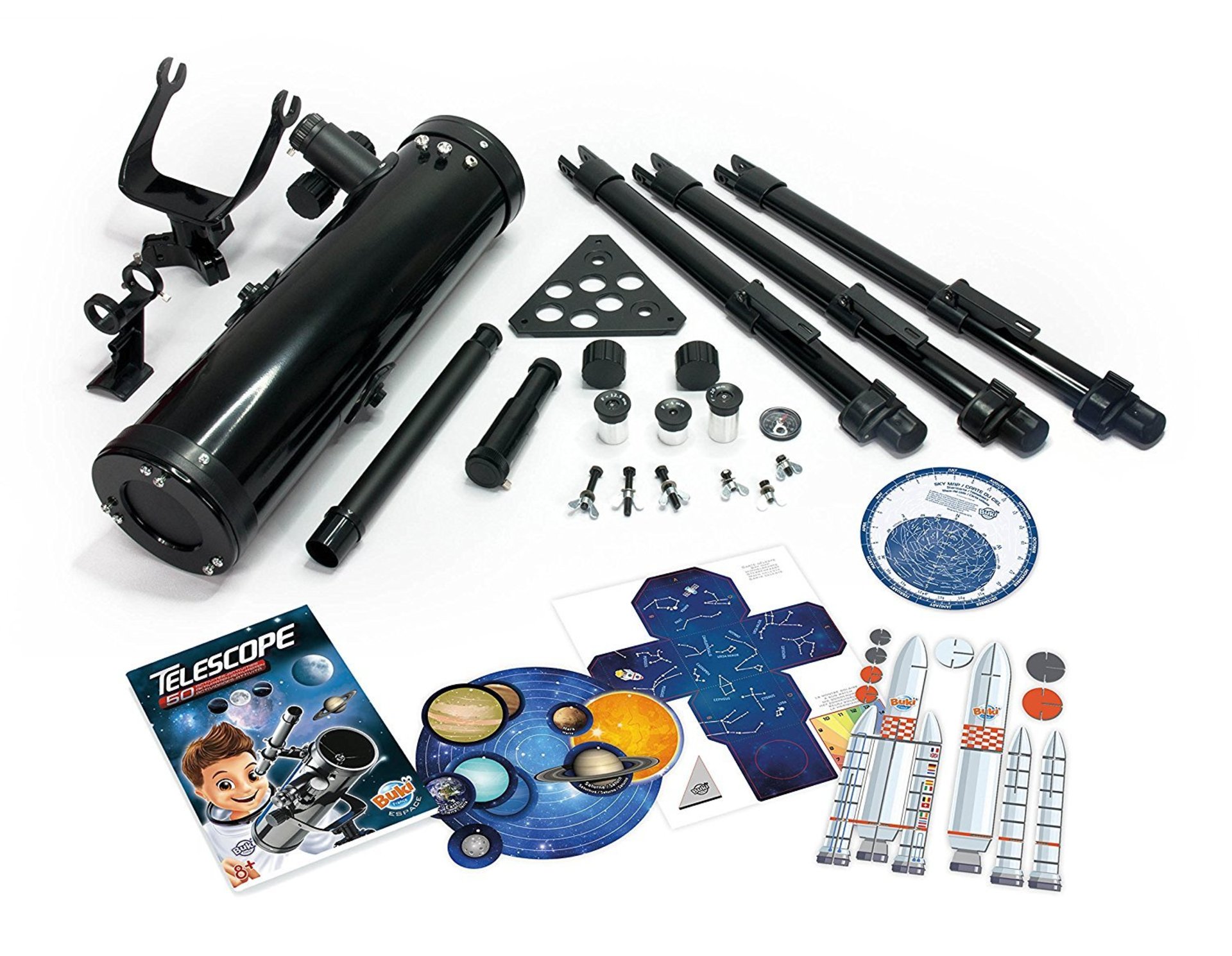 Un télescope réflecteur avec une notice de 50 activités pour découvrir le ciel étoilé, les planètes et les cratères lunaires.