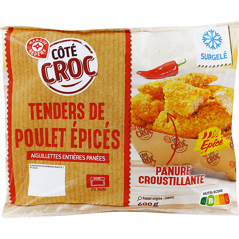 Ingrédients : Aiguillette de poulet 66 %, panure 17,9 % (farine de blé, pétales de maïs, eau, levure, sel, huile de colza, épices 0,14 %, extraits d'épices), eau, farine de blé , sel, fibres de blé , amidon de tapioca, arômes, glucose, piment de Cayenne 0,04 %, paprika 0,04 %, extraits d'épices. Huile de friture : huile de colza.