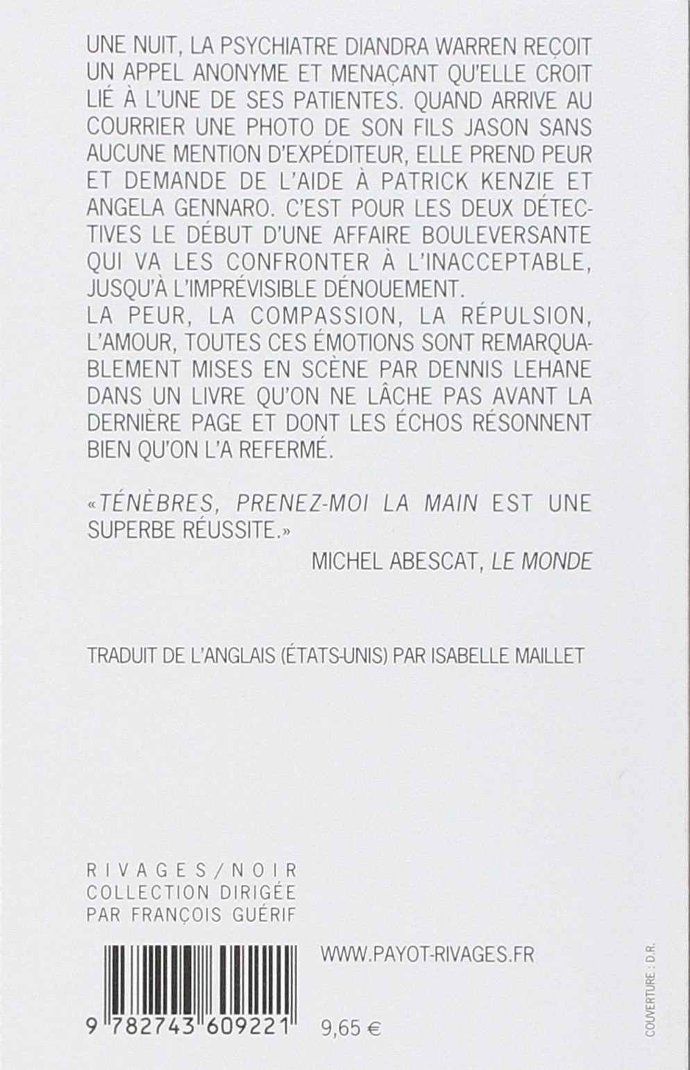 La peur, la compassion, la répulsion, l'amour, toutes ces émotions sont remarquablement mises en scène par dennis lehane dans un livre qu'on ne lâche pas avant la dernière page et dont les échos résonnent bien après qu'on l'a refermé.