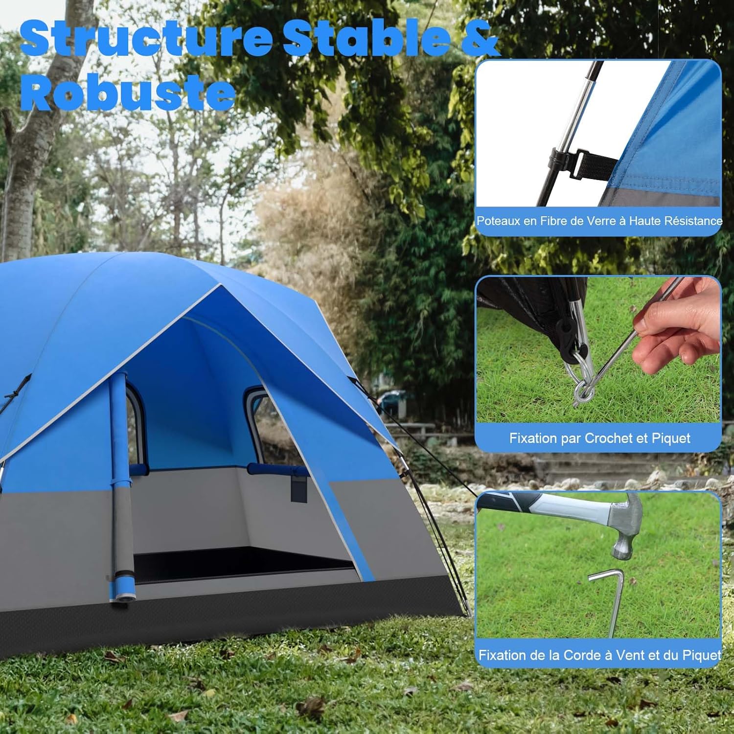- Cadre Robuste et Stable : Soutenue par des poteaux en fibre de verre résistants aux fissures, cette tente de camping garantit une résistance durable. Elle comprend également 4 cordes à vent et 8 piquets de sol pour une fixation sécurisée, offrant une stabilité et une protection ultimes dans diverses conditions.