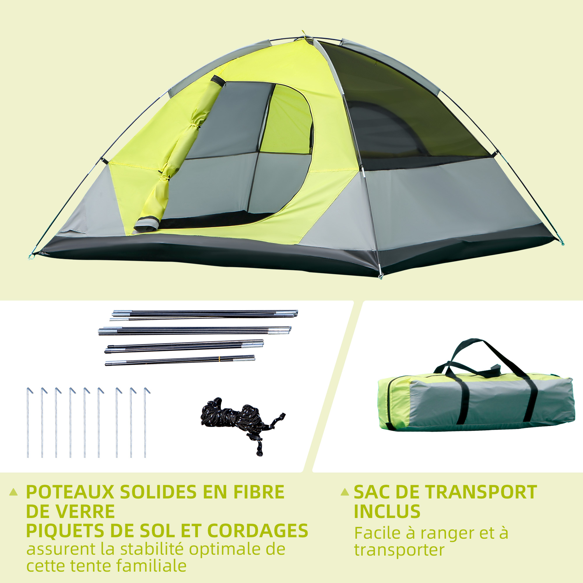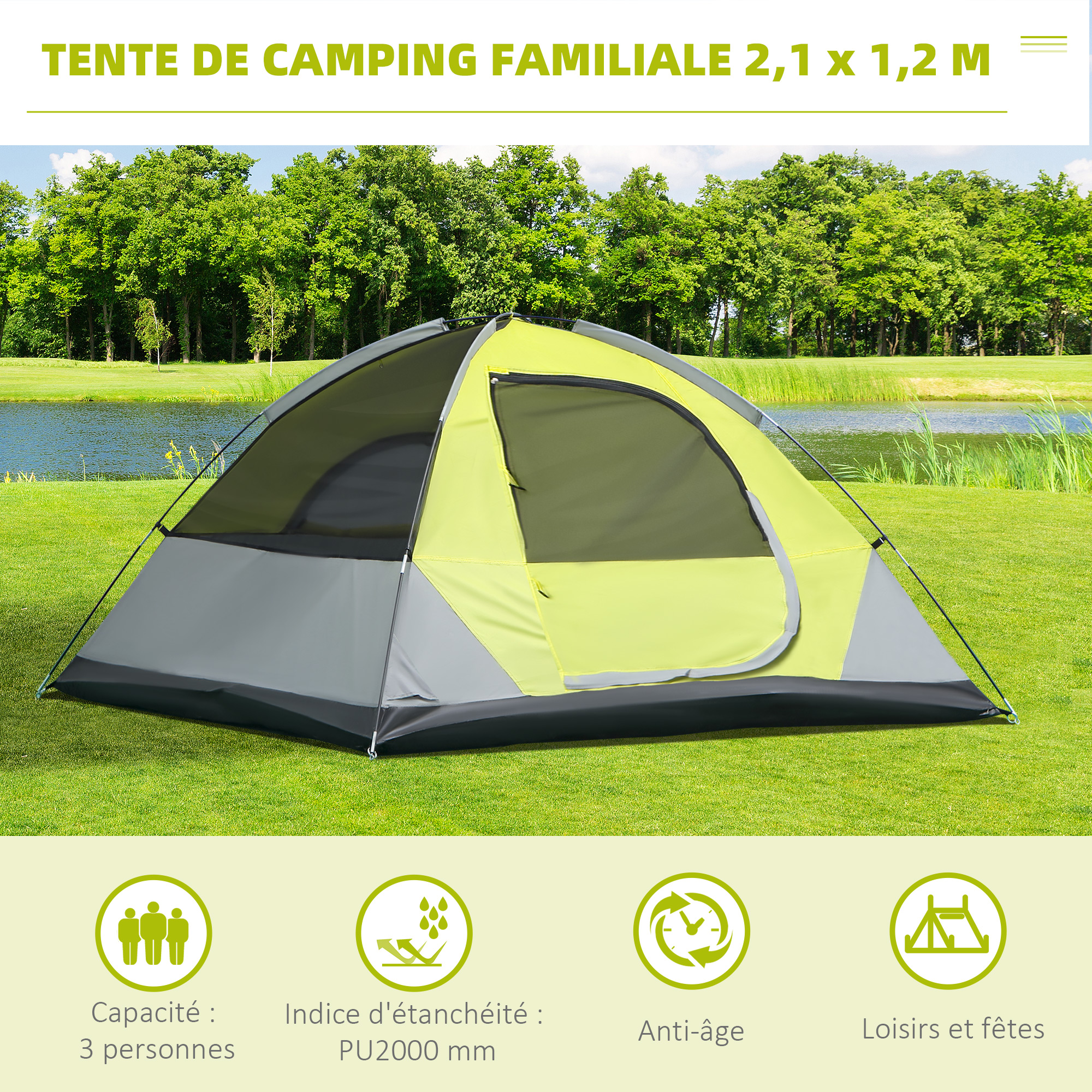 | Libellé | Tente de camping 3 personnes - portes zippées, poche rangement, sac transport inclus - dim. 210L x 210l x 119H cm - fibre verre polyester tissu Oxfor |