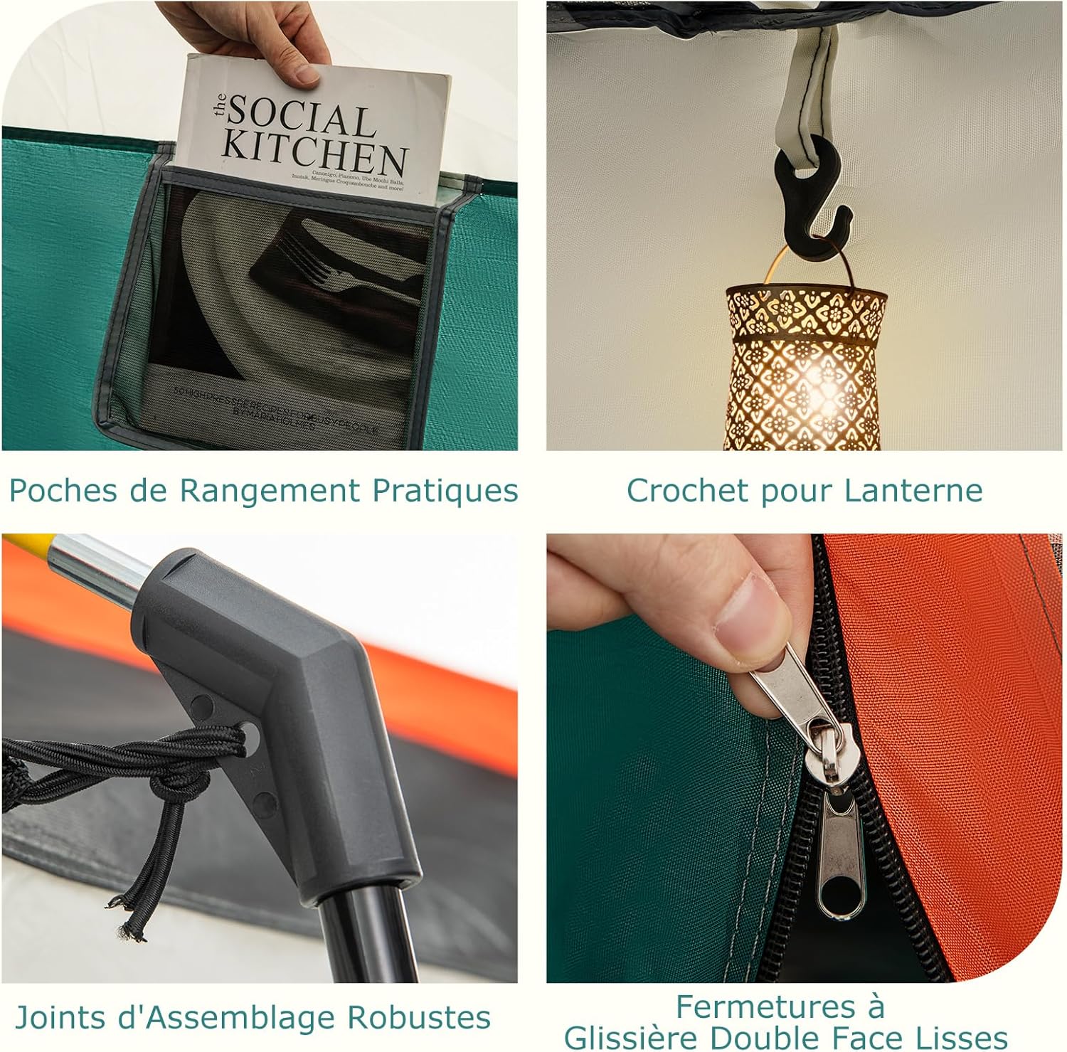 • Détails de qualité supérieure : Dotée de fenêtres en treillis roulables permettant une ventilation optimale et d'une grand vue imprenable, cette tente utilise un tissu Oxford imperméable, assurant une protection contre les pluies légères, tout en gardant l'intérieur sec et agréable.