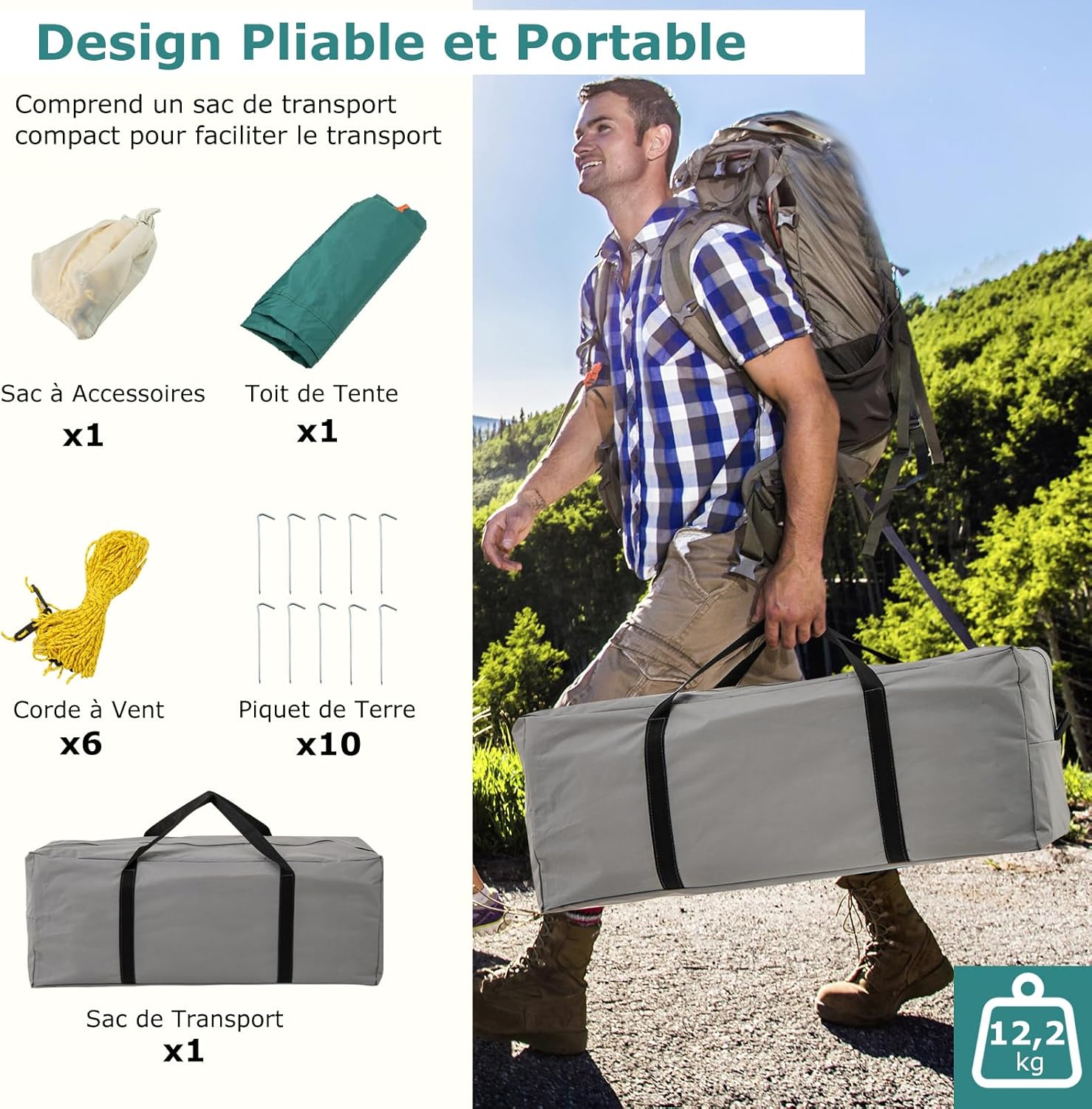 • Structure robuste et stable : Conçue pour une utilisation en extérieur, cette tente de camping est soutenue par des poteaux en fibre de verre haute résistance. Elle est également équipée de 16 piquets métalliques et 8 cordes à vent, assurant stabilité et sécurité lors de vos aventures en plein air.
