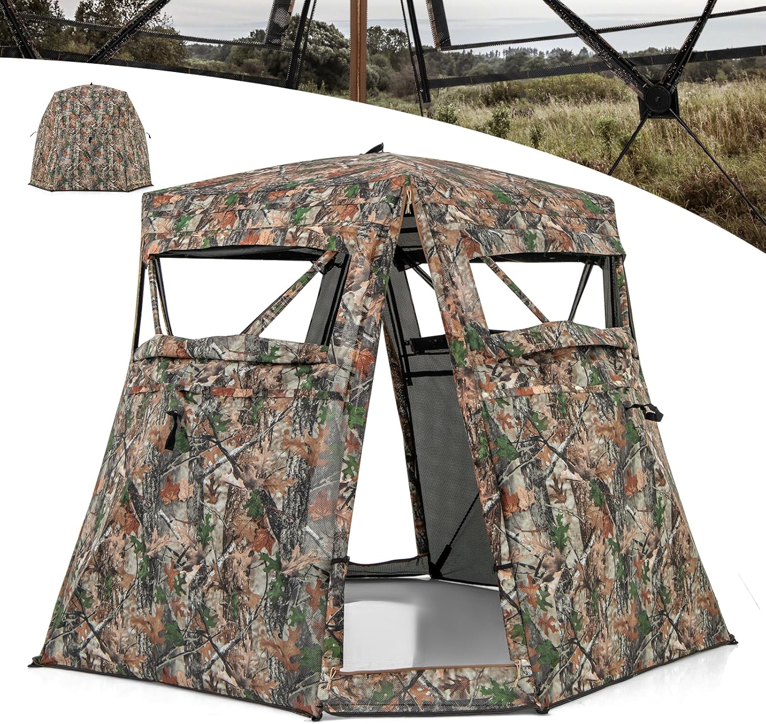 - Grand Espace et Design Camouflage: Cette tente de chasse offre un espace pour 2-3 personnes et est équipée d’une porte à fermeture éclair fluide pour une intimité totale. L’extérieur camouflage se fond parfaitement dans différents environnements naturels, assurant que vous restiez indétectable lors de vos activités de chasse.