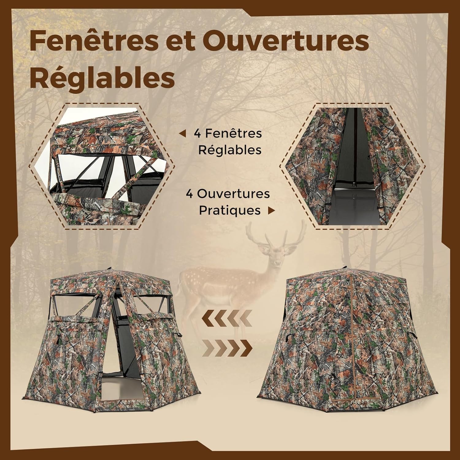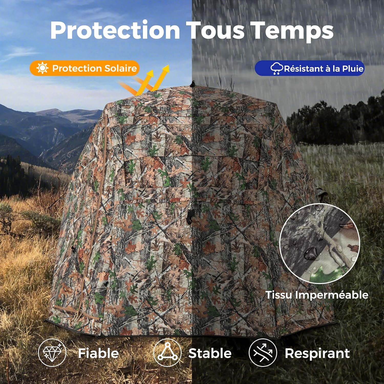 | Libellé | Tente de chasse portable 2-3 personnes, tente de camouflage avec visibilité à 360° et 4 fenêtres |