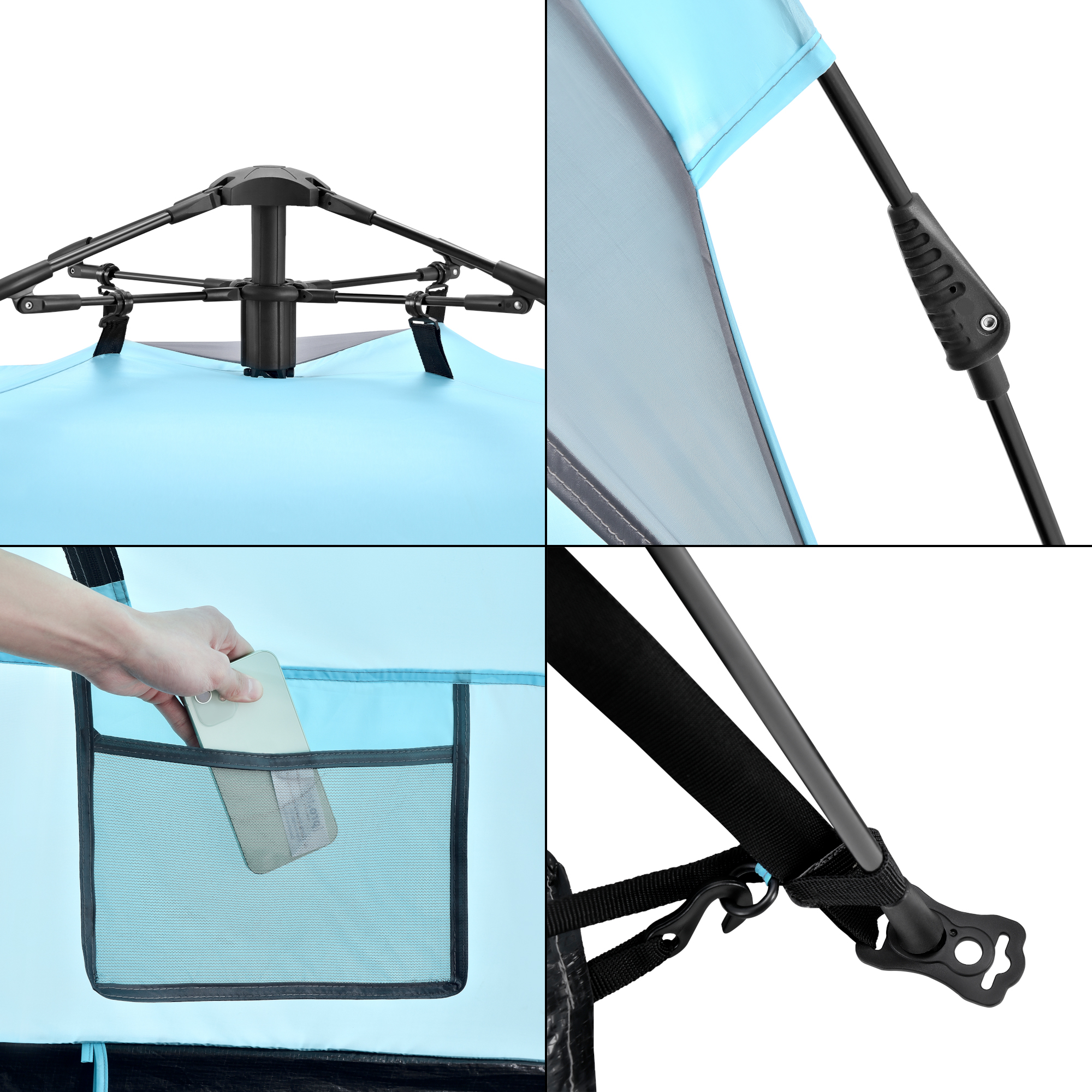 Vous pourrez déplier et replier cette tente en quelques secondes comme une parapluie. Sa fixation au sol est simple grâce aux piquets d'ancrage et aux cordes de haubanage. Elle est parfaite pour les voyages, activités extérieures, plages, festivals entre autres.