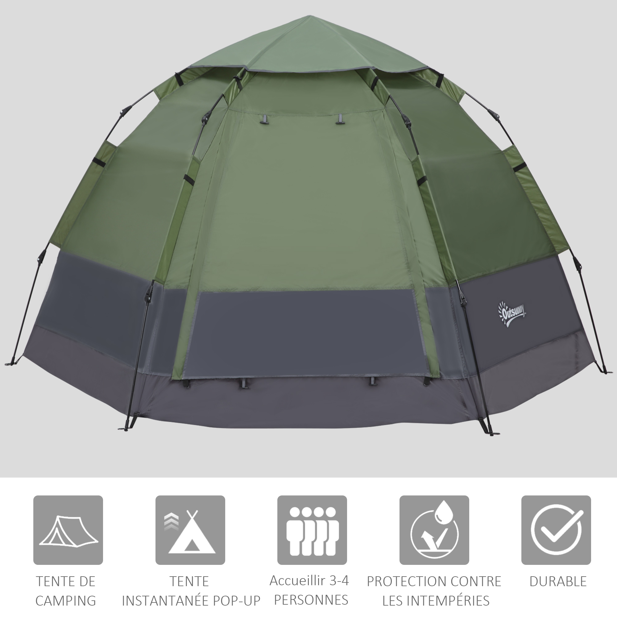 | Libellé | Tente pop up montage instantané - tente de camping 3-4 pers. - 2 grandes portes - dim. 2,6L x 2,6l x 1,5H m fibre verre polyester oxford vert gris |