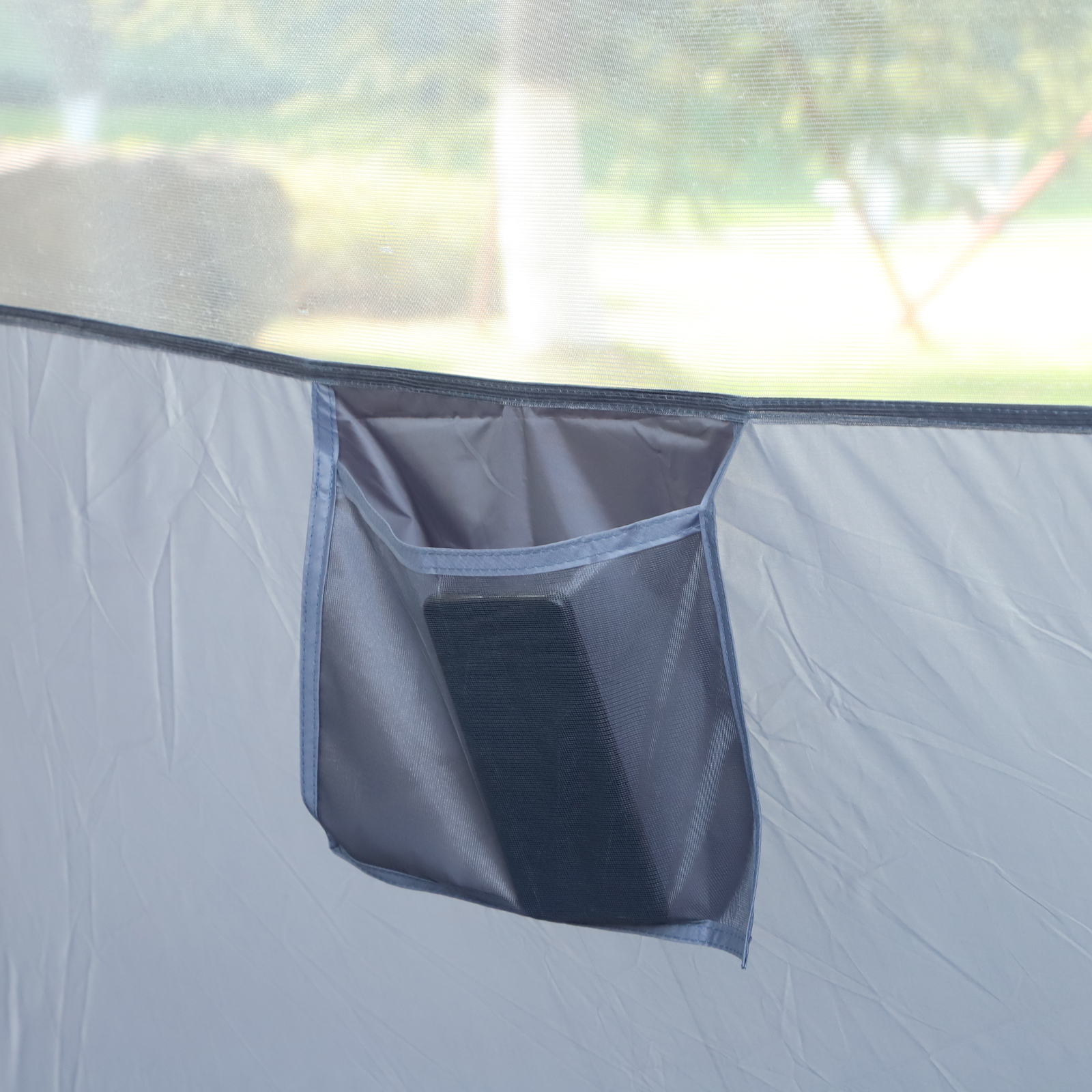 - Grande porte d'entrée en forme de D + 3 fenêtres avec moustiquaire : ventilation et protection optimale contre les insectes