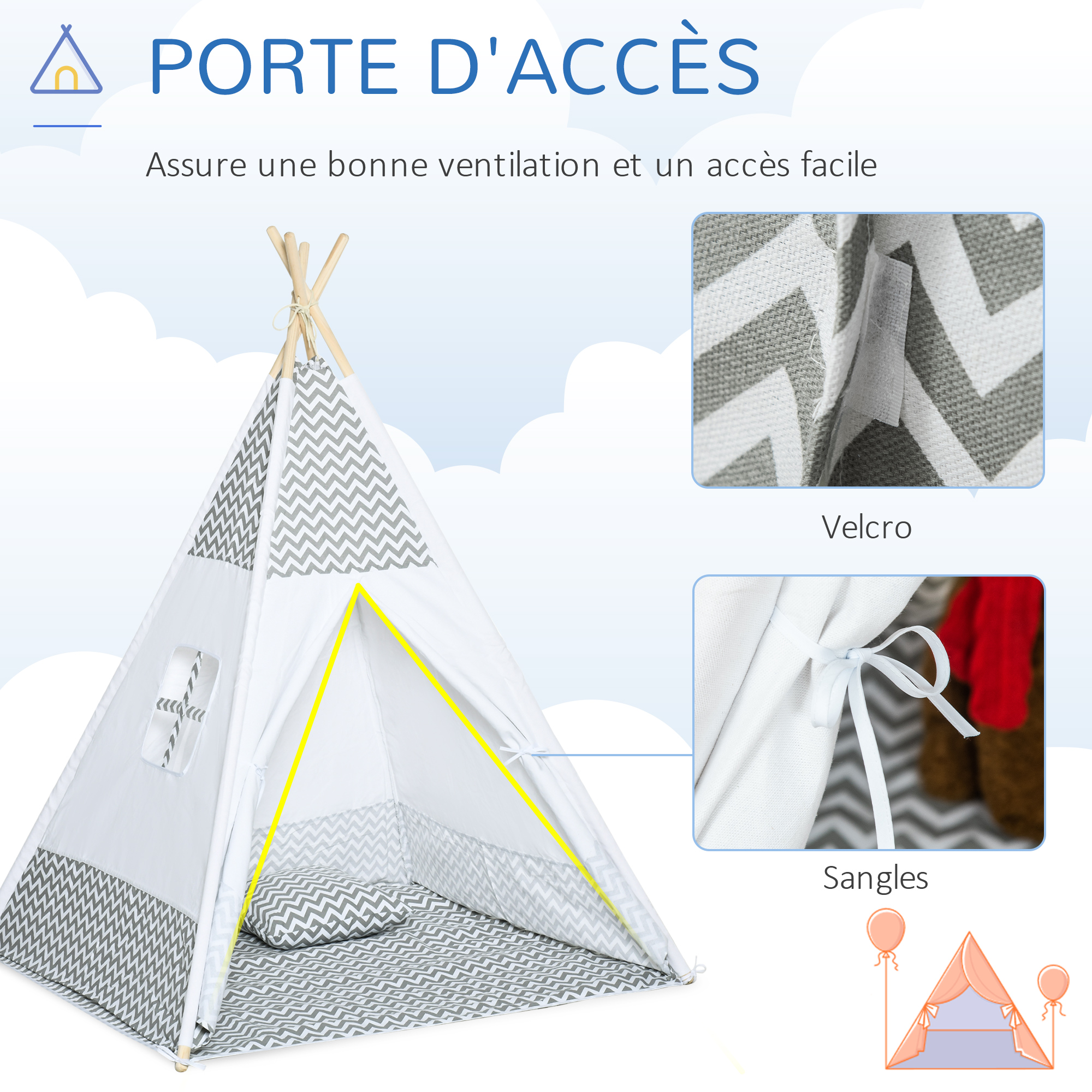 | Libellé | Tente teepee indien enfant style graphique - dim. 1,2L x 1,2I x 1,55H m - porte refermable, fenêtre, tapis, coussin, sac transport inclus - structure |