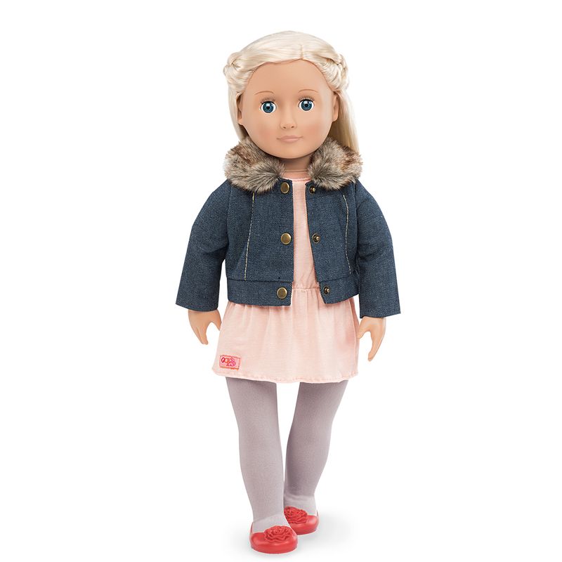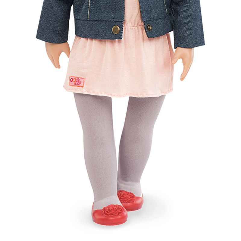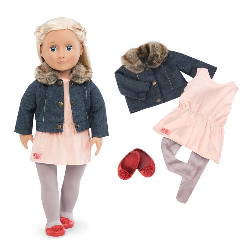 Tenue Classique, tunique et veste en jean. Cette tenue comporte : une veste en jean, une robe, une paire de collants et une paire de chaussures.