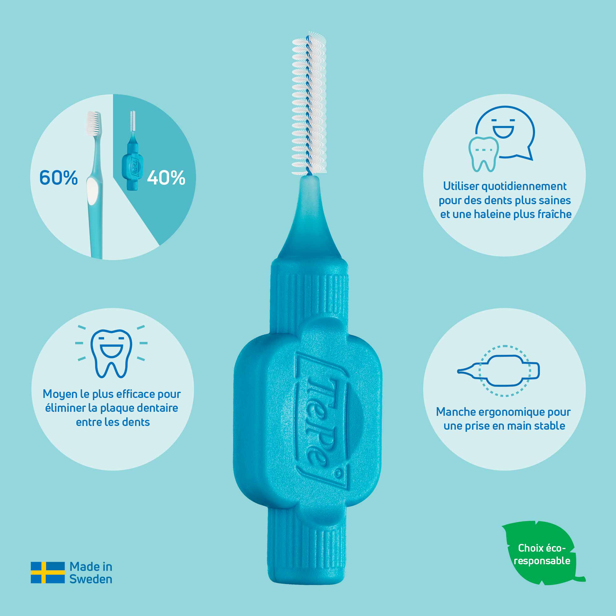 La brossette interdentaire est le moyen le plus efficace pour éliminer la plaque entre les dents. Les brossettes interdentaires TePe sont conçues pour nettoyer les espaces entre les dents inatteignables avec une brosse à dents classique. En usage quotidien, elles permettent de garder des gencives et des dents saines. La brossette interdentaire peut être utilisée pour nettoyer les espaces entre les dents, les implants, les couronnes et les bridges. Elle est également adaptée au nettoyage des braquettes et du fil en orthodontie. La brossette interdentaire TePe Originale est disponible en 9 tailles codées par couleur afin de couvrir entièrement les variétés d'espaces interdentaires - tailles ISO 0-8. Les brossettes interdentaires sont développées en collaboration avec des experts dentaires pour en garantir la qualité optimale. Son utilisation quotidienne peut aider à éliminer jusqu'à 40 % de plaque supplémentaire à un simple le brossage des dents. L'élimination efficace de la plaque dentaire prévient l'inflammation des gencives, les caries et la mauvaise haleine. En remplaçant les matières premières fossiles par des matières végétales certifiées via l'approche du bilan de masse, nous avons réduit de manière significative l'empreinte carbone de la brossette interdentaire, sans compromettre la qualité, l'efficacité ou la conception du dispositif.