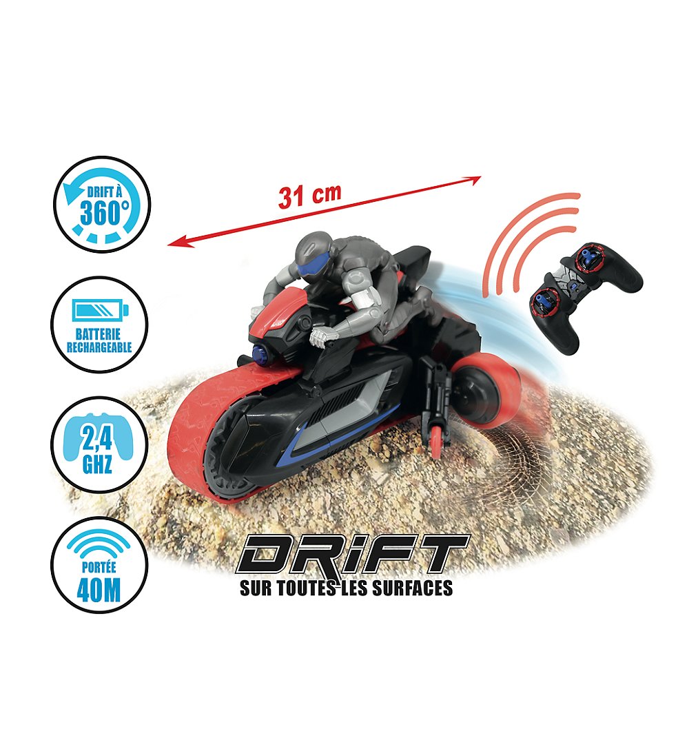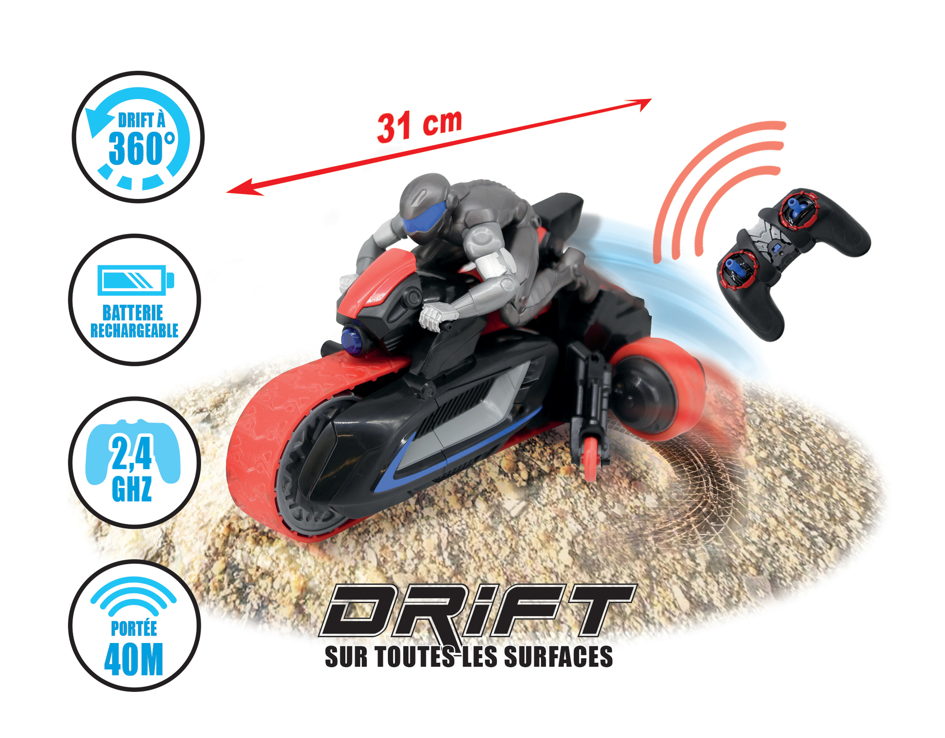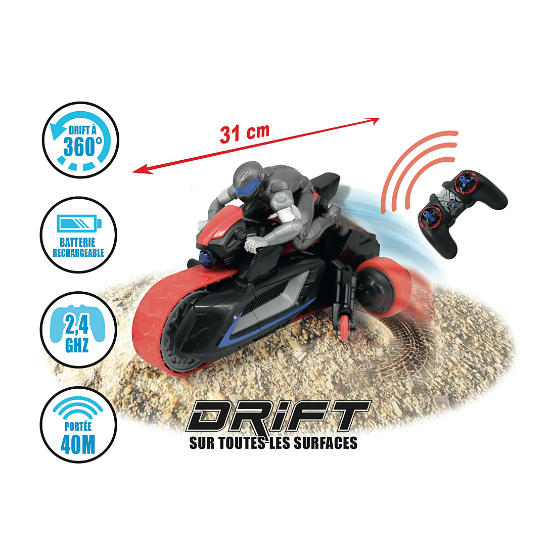 Une expérience inédite avec le nouveau véhicule RC tout terrain : TERRATRAX Drift Cycle ! Conduis, drift, tourne et glisse cette moto nouvelle génération sur tous les terrains : béton, neige, terre... rien ne lui résiste ! Ce véhicule, facile d'utilisation, réalise des drifts impressionnants à 360° ! Parfait pour un usage en intérieur comme en extérieur. Portée de 20 m, technologie 2,4 Ghz, vitesse maximum 6 Km/h. Lumières LED sur le devant du véhicule. Batterie rechargeable intégrée.