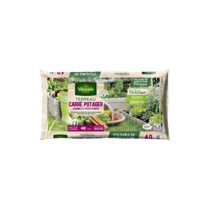 Composition Unique pour des Plantes RobustesLe Terreau pour Carrés Potagers se distingue par sa composition soigneusement élaborée, destinée à enrichir vos carrés potagers. Ce mélange prêt à l'emploi est le fruit d'une recherche approfondie visant à maximiser le potentiel de croissance de vos plantes. En offrant à vos semis et plantations l'environnement idéal pour s'épanouir, ce terreau assure une base solide pour des récoltes abondantes et de qualité. Sa formule unique favorise un développement racinaire vigoureux, essentiel pour des plantes fortes et résilientes.Avantages Multiples pour le JardinierUtiliser ce terreau dans votre jardin offre une multitude de bénéfices. Il stimule la reprise des plantations et améliore significativement les récoltes en régulant l'humidité du sol, que ce soit en cas de manque ou d'excès d'arrosage. Ce support de culture garantit un enracinement profond et une nutrition optimale des racines, tout en étant conforme aux pratiques d'agriculture biologique (UAB). Sa facilité d'utilisation et son efficacité sont attestées, faisant de lui un choix privilégié pour les jardiniers soucieux de leurs cultures.Conseils d'Utilisation PratiquesPour tirer le meilleur parti de ce terreau, positionnez votre carré potager dans un espace ouvert bénéficiant d'une bonne exposition solaire. Protégez vos jeunes pousses avec un voile d'hivernage en début de saison pour les préserver des intempéries. Pour maintenir la fertilité du sol, renouvelez la moitié du terreau avec notre produit à chaque nouvelle saison. L'ajout d'un engrais organique ou organo-minéral, quelques semaines après la plantation et ensuite régulièrement, contribuera à une croissance saine et soutenue de vos plantes.Cadre d'Utilisation OptimalCe terreau est spécialement adapté pour les carrés potagers, un choix de plus en plus populaire chez les jardiniers modernes. Que vous soyez un amateur cherchant à débuter en jardinage ou un expert en quête de solutions efficaces pour optimiser vos espaces de culture, ce produit répond à vos besoins. Son format de 40 litres est idéal pour remplir ou rafraîchir vos carrés potagers, offrant une solution pratique et performante pour toutes sortes de cultures, des légumes aux herbes aromatiques.
