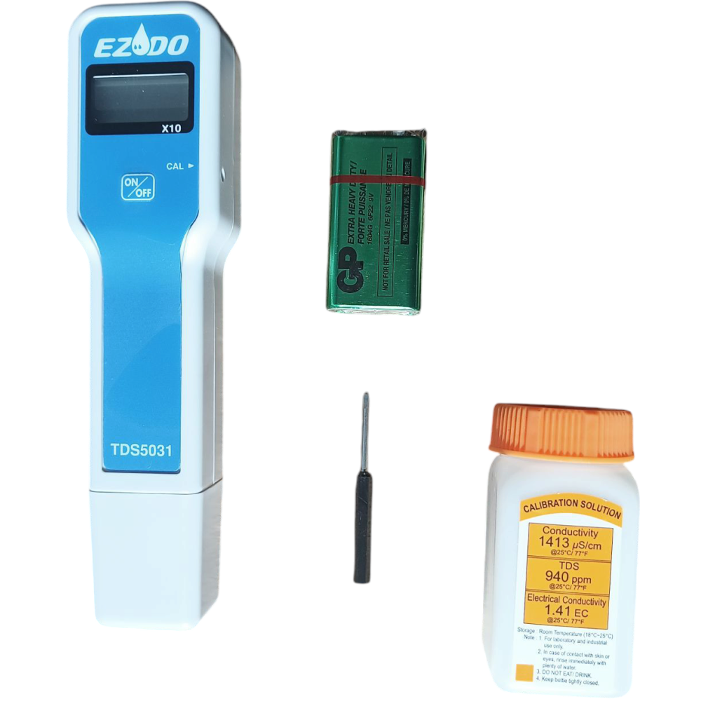 Inclus un flacon d'étalonnage ainsi qu'une pile.
