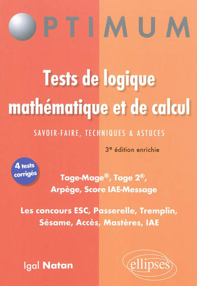 | Libellé | Tests de logique mathématique et de calcul. Savoir-faire, techniques et astuces. Tage-Mage, Tage 2, Arpège, Score IAE-Message. Les concours ESC, Pass |