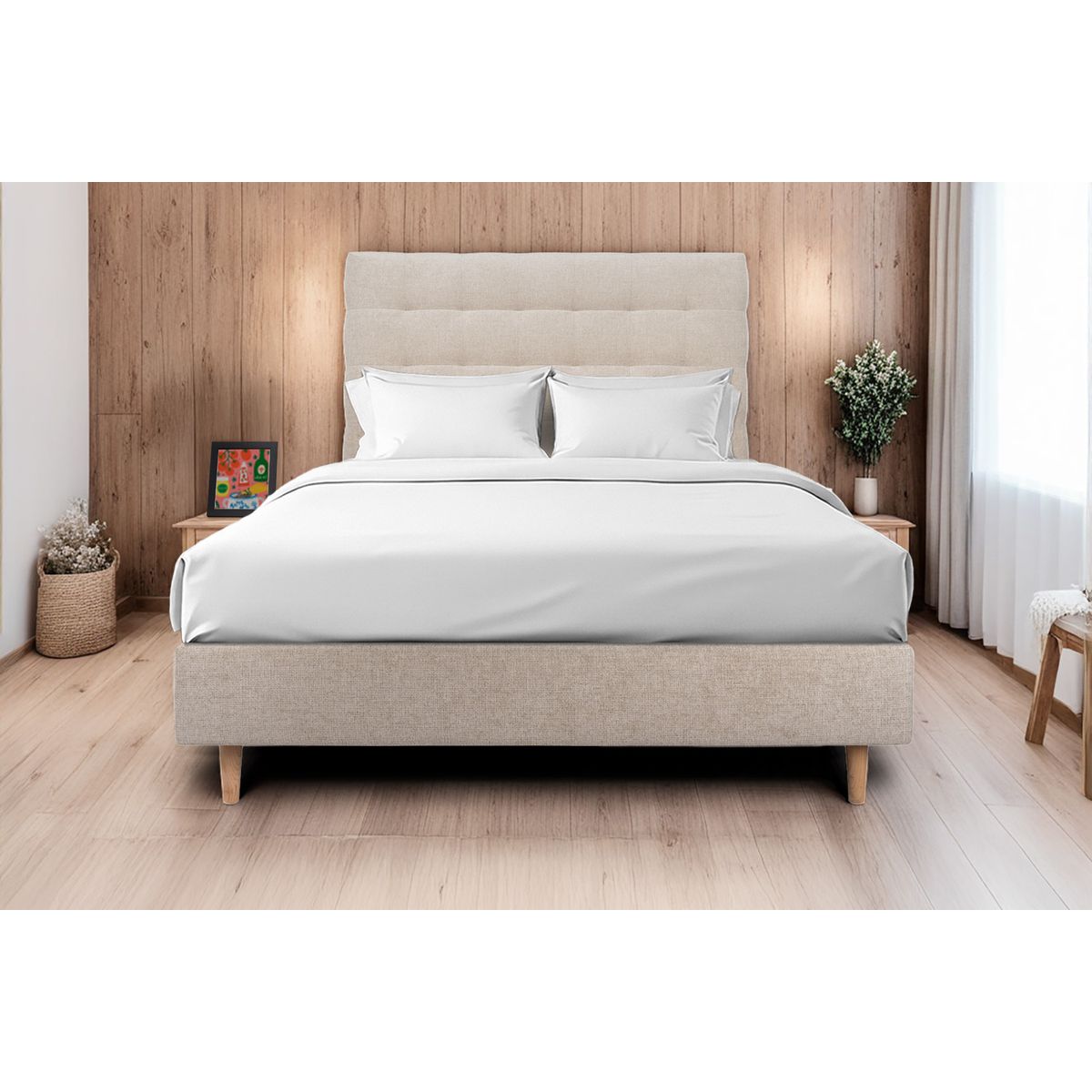 La tete de lit Tissu habille et donne du caractère à votre chambre. Elle est vendue montée et est très facile à installer. Il vous suffit juste de la poser au sol entre le sommier et le mur.