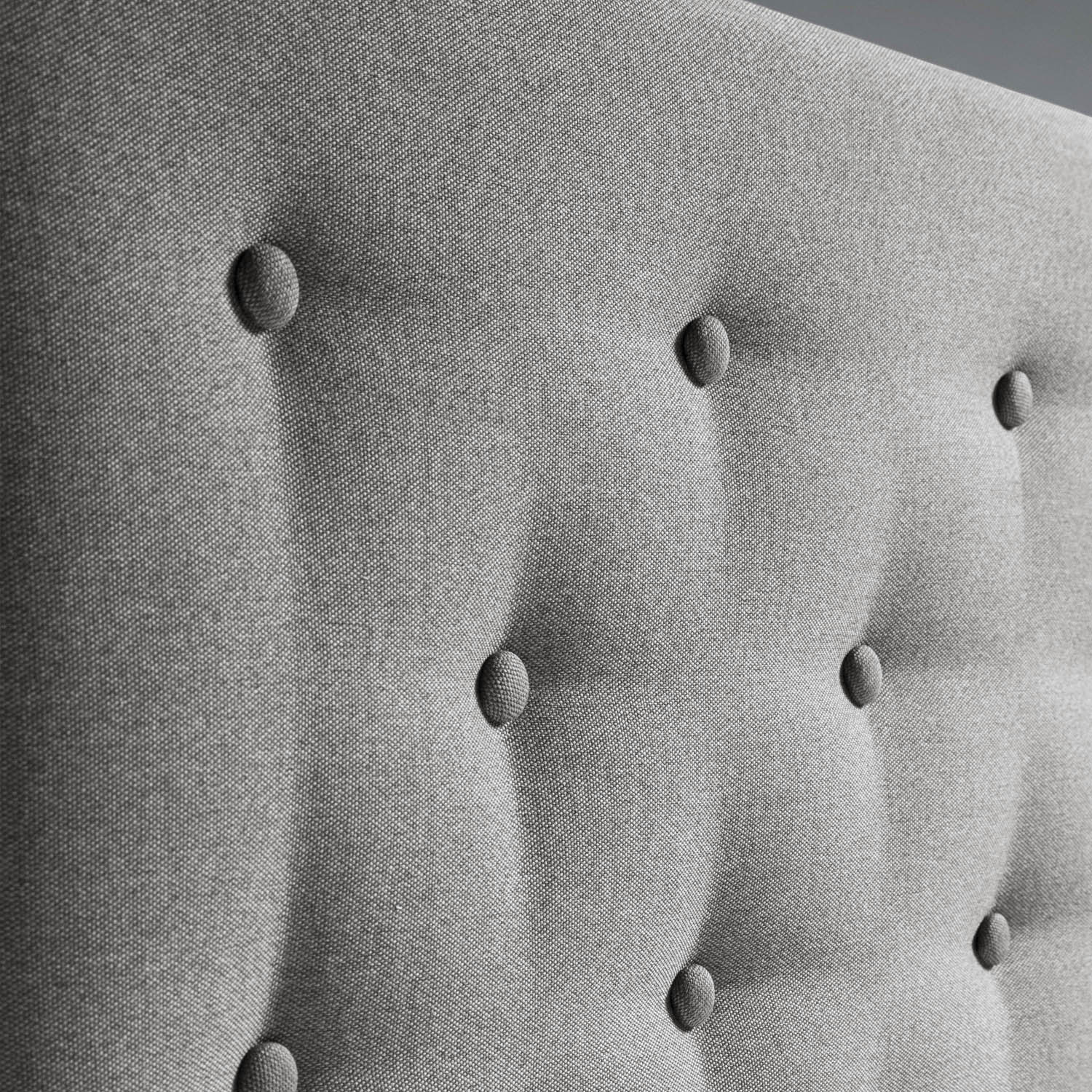 •Tapissée en gris avec capitonné de la même couleur. •Pieds de style nordique en hêtre naturel. •Structure rigide de contreplaqué qui allège le poids de la tête de lit pour l'ancrer au mur facilement. • Rembourrage en mousse HR de la partie frontale et coins. •Planche arrière en tissus transpirant couleur noir. •Inclut ancrage pour mur. •L'épaisseur totale est de 8 cm. •Hauteur totale avec pieds 100 cm. •MADE IN SPAIN.