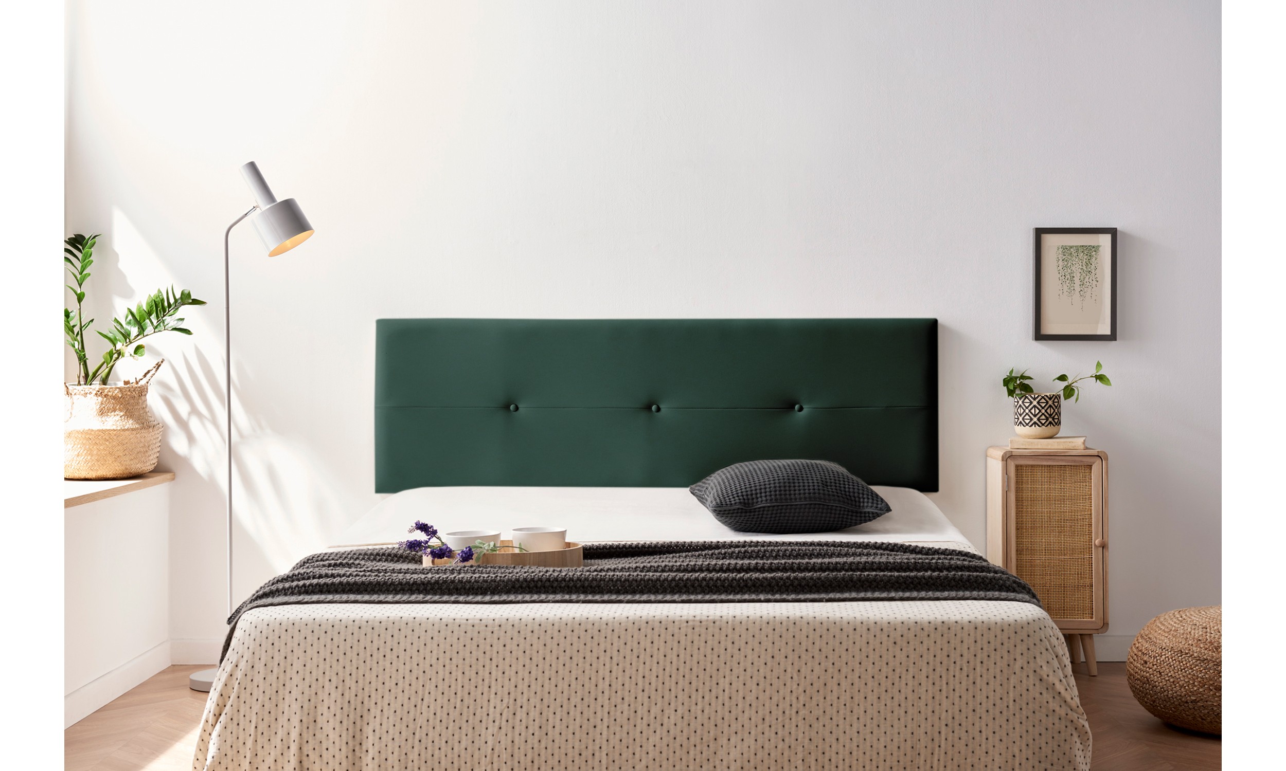C'est une tête de lit au tissu linéaire orné de boutons qui donnent à votre chambre harmonie, symétrie et équilibre.