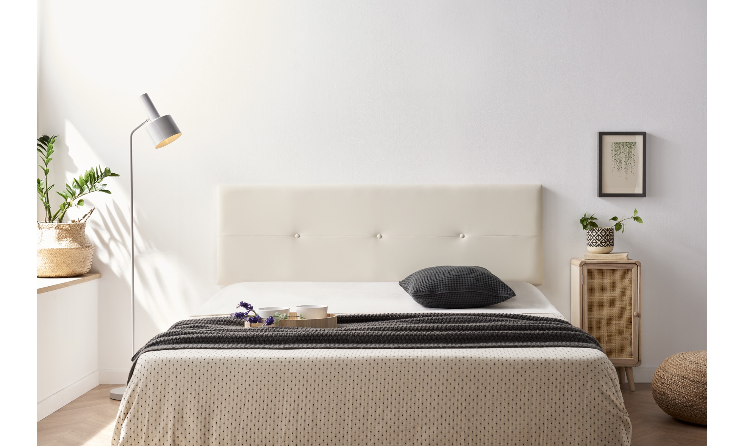 C'est une tête de lit au tissu linéaire orné de boutons qui donnent à votre chambre harmonie, symétrie et équilibre.