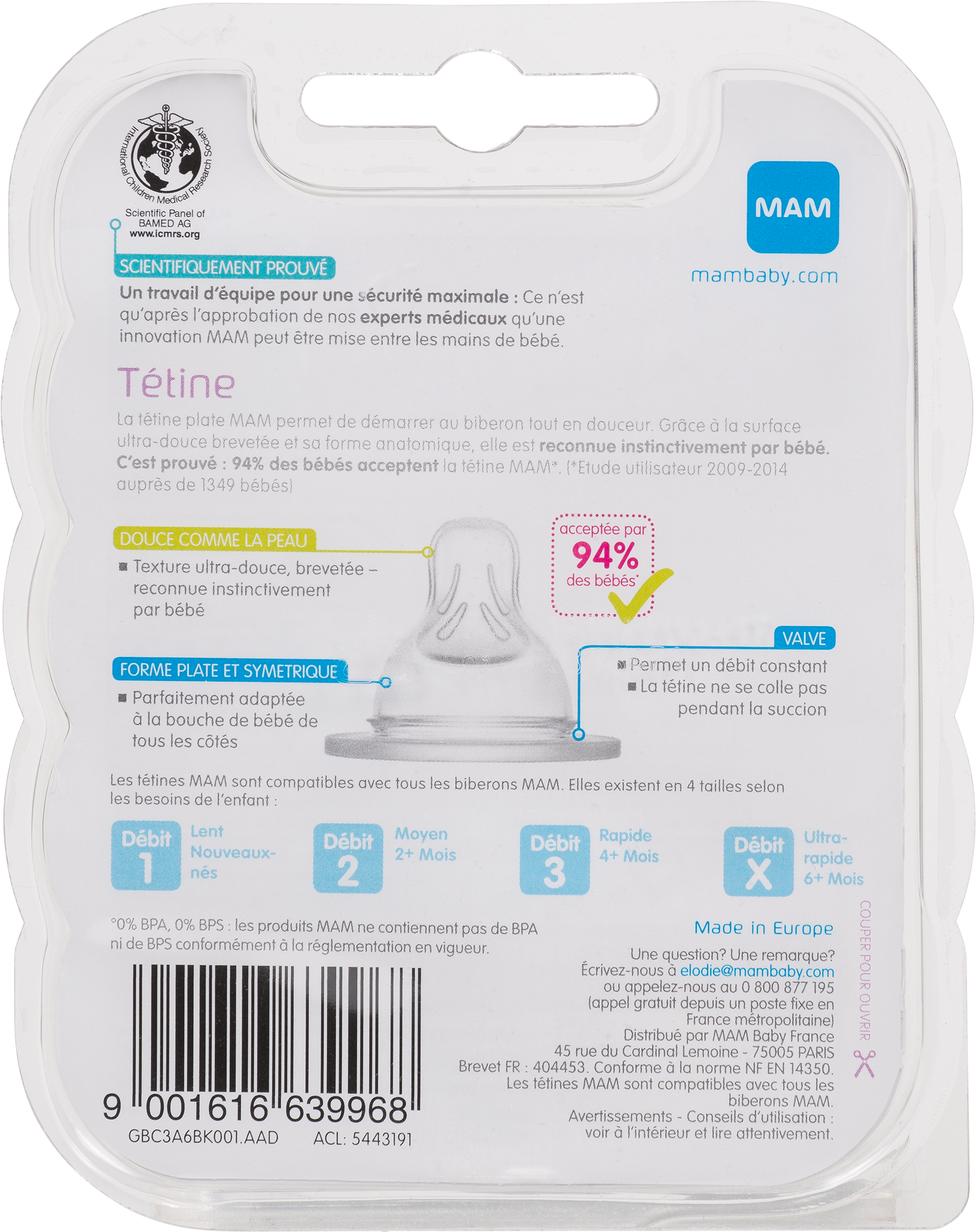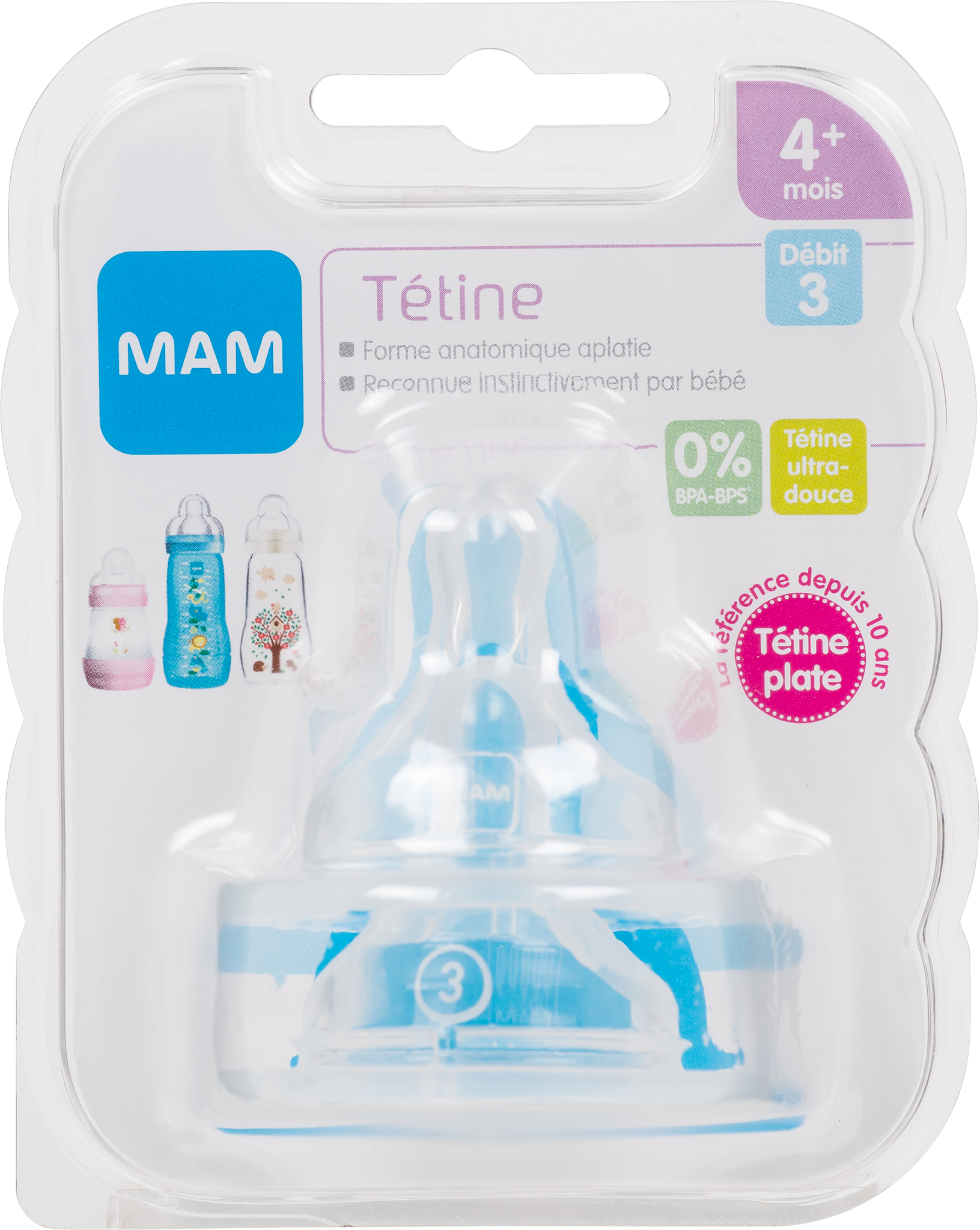 La tétine MAM a été spécialement conçue pour permettre à votre bébé de démarrer au biberon tout en douceur: - Tétine plate reconnue instinctivement par bébé - Une texture unique, aussi douce que la peau d'une maman - Large et souple, en silicone - L'intérieur de la tétine est légèrement strié évitant ainsi que la tétine ne se colle pendant la succion de bébé - Le repère numérique indique le type de débit de la tétine, - Lot de 2 tétines - Débit 3 Rapide