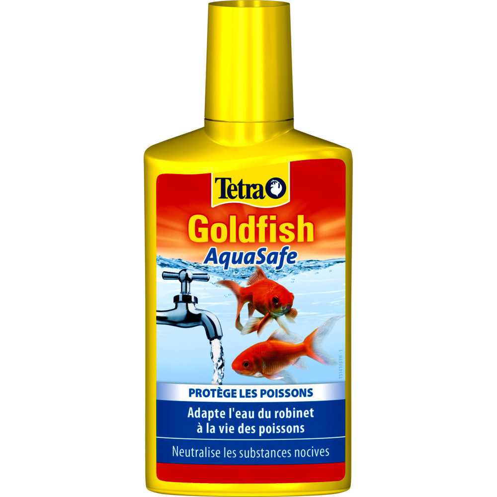 Tetra Goldfish AquaSafe se dissout en un clin d'œil et transforme instantanément l'eau du robinet en une eau comme à l'état naturel. Ainsi elle est adaptée à la vie de vos poissons. Grâce à une composition unique de vitamines, de biopolymères naturels et d'oligo-éléments, la nouvelle formule contribue à la santé de vos poissons. Goldfish AquaSafe crée ainsi une eau dans laquelle les poissons se sentent comme dans leur habitat naturel. Les agents nocifs pour les poissons contenus dans l'eau du robinet sont neutralisés instantanément : le chlore et les chloramines sont éliminés, et les métaux lourds comme le cuivre, le zinc ou le plomb sont parfaitement fixés grâce à un agent complexant. Les substances vitales présentes dans les biotopes naturels des poissons sont ajoutées. Ce complexe optimal de vitamines réduit ainsi le stress et assure une bonne santé à vos poissons sur le long terme. De plus il protège les branchies et les muqueuses fragiles des poissons grâce à l'action des colloïdes. Ce produit contient des colloïdes bio facilitant le développement des bactéries utiles à la filtration de votre eau. Produit destiné à tous les aquariums d´eau froide et aquariums. Application : Traitez l'eau du robinet en ajoutant 5 ml de Goldfish AquaSafe pour 10 litres d'eau. À utiliser lors de l'installation d'un nouvel aquarium, d'un changement d'eau ou du transport de vos poissons!