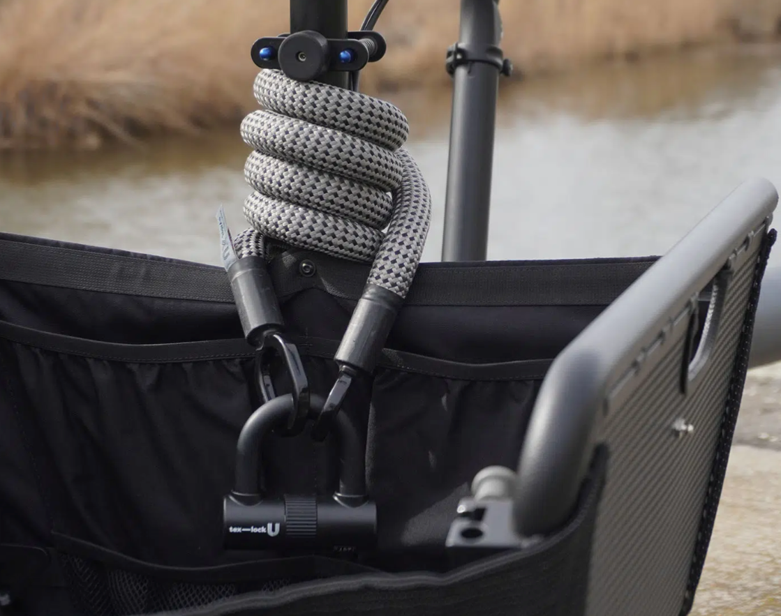 - Matière : fibres techniques aramides (famille du kevlar), acier trempé (chaîne interne), acier trempé 11 mm (U-lock et boucles)