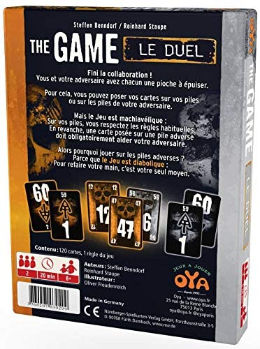 à partir de 8 ans moins de 30 min 2 joueur(s) Fini la collaboration ! Vous et votre adversaire avec chacun une pioche à épuiser. Pour cela, vous pouvez poser vos cartes sur vos piles ou sur les piles de votre adversaire. Mais le jeu est machiavélique : sur vos piles, vous respectez vos règles habituelles. En revanches, une carte posée sur un pile adversaire doit obligatoirement aider votre adversaire. Alors pourquoi jouer sur les piles adverses ? Parce que le jeu est diabolique: pour refaire votre main, c'est votre seule moyen.