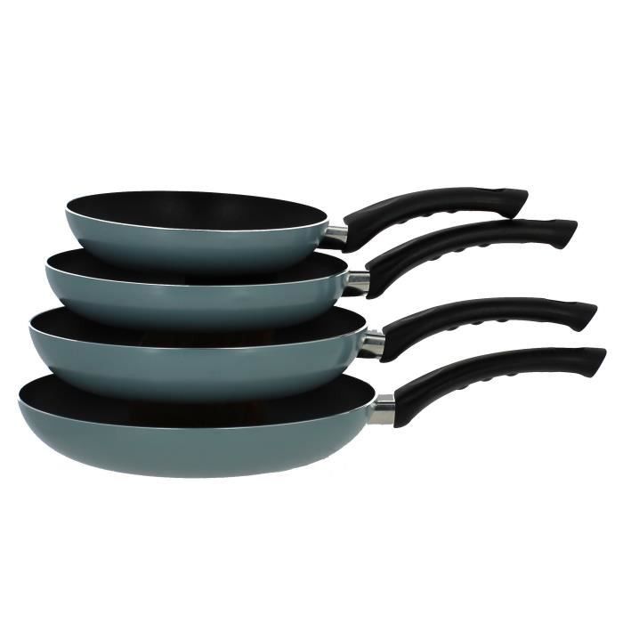 Poele en aluminium pressé de coloris bleu pastel pour un look rétro. Revetement anti-adhésif double couche noire. Poignée ergonomique tout usage. Tous feux dont induction. Epaisseur : 2,2mm. Diametre : 26cm.