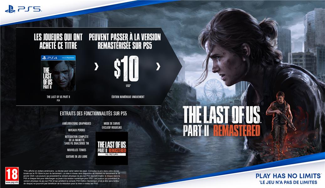 The Last of Us Part II Remastered apporte toute une gamme de nouvelles fonctionnalités, de modes de jeu et d'améliorations techniques qui vous permettront de découvrir l'histoire poignante d'Ellie et Abby de la meilleure des manières. Cinq ans après leur voyage périlleux à travers une Amérique ravagée par une pandémie, Ellie et Joel ont trouvé refuge à Jackson, dans le Wyoming. Vivre parmi une communauté prospère de survivants leur a permis de trouver paix et stabilité, malgré la menace constante des infectés ainsi que des autres survivants. Lorsqu'un violent évènement vient rompre cette paix, Ellie se lance dans une quête de justice pour enfin tourner la page. Alors qu'elle pourchasse les responsables un par un, elle est confrontée aux répercussions dévastatrices de ses actions aussi bien physiques qu'émotionnelles.