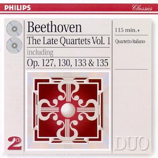 | Liste des pistes | 1.1 . quartet op127 en mi bemol majeur: maestoso allegro - Van Beethoven, Ludwig 1.2 . quartet op127 en mi bemol majeur: adagio ma non troppo - Van Beethoven, Ludwig 1.3 . quartet op127 en mi bemol majeur: scherzando vivace - Van Beethoven, Ludwig 1.4 . quartet op127 en mi bemol majeur: finale - Van Beethoven, Ludwig 1.5 . quartet op135 en fa majeur: allegretto - Van Beethoven, Ludwig 1.6 . quartet op135 en fa majeur: vivace - Van Beethoven, Ludwig 1.7 . quartet op135 en fa majeur: lento assai - Van Beethoven, Ludwig 1.8 . quartet op135 en fa majeur: grave allegro - Van Beethoven, Ludwig 2.1 . quartet op130 en si bemol majeur: adagio ma non troppo - Van Beethoven, Ludwig 2.2 . quartet op130 en si bemol majeur: presto - Van Beethoven, Ludwig 2.3 . quartet op130 en si bemol majeur: andante con moto - Van Beethoven, Ludwig 2.4 . quartet op130 en si bemol majeur: allegro assai - Van Beethoven, Ludwig 2.5 . quartet op130 en si bemol majeur: adagio molto espressivo - Van Beethoven, Ludwig 2.6 . quartet op130 en si bemol majeur: finale allegro - Van Beethoven, Ludwig 2.7 . grosse fuge op133 en si bemol majeur: overture - Van Beethoven, Ludwig |