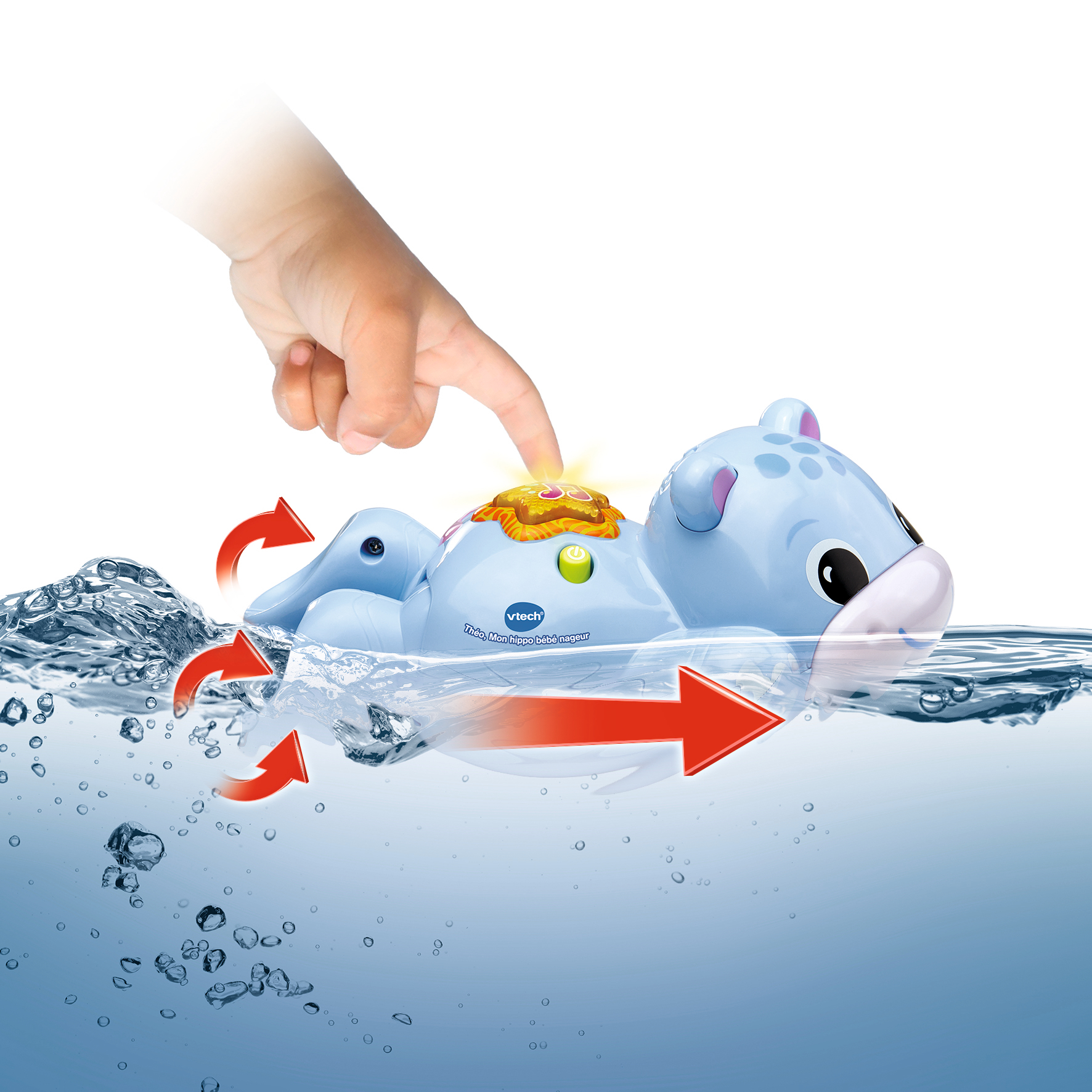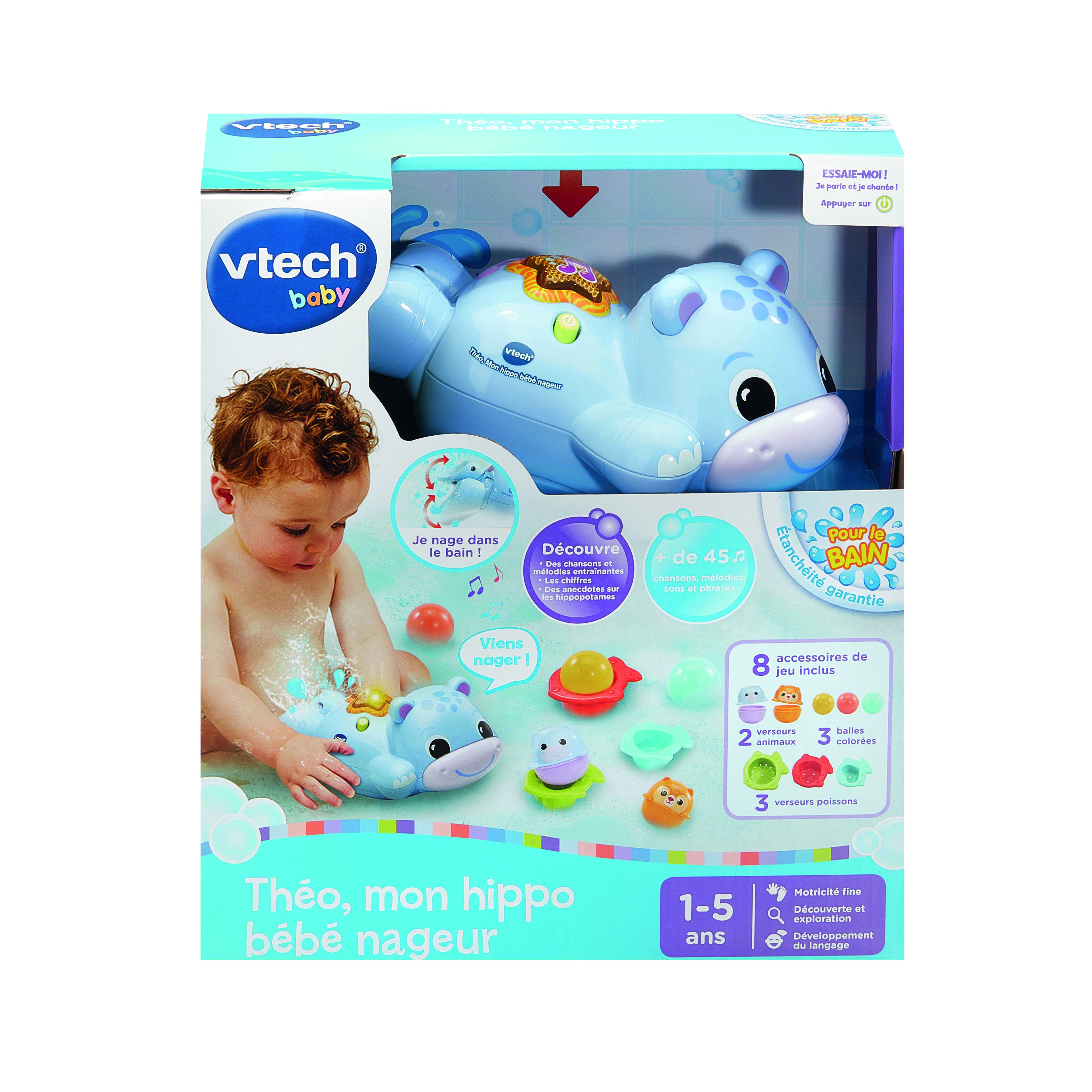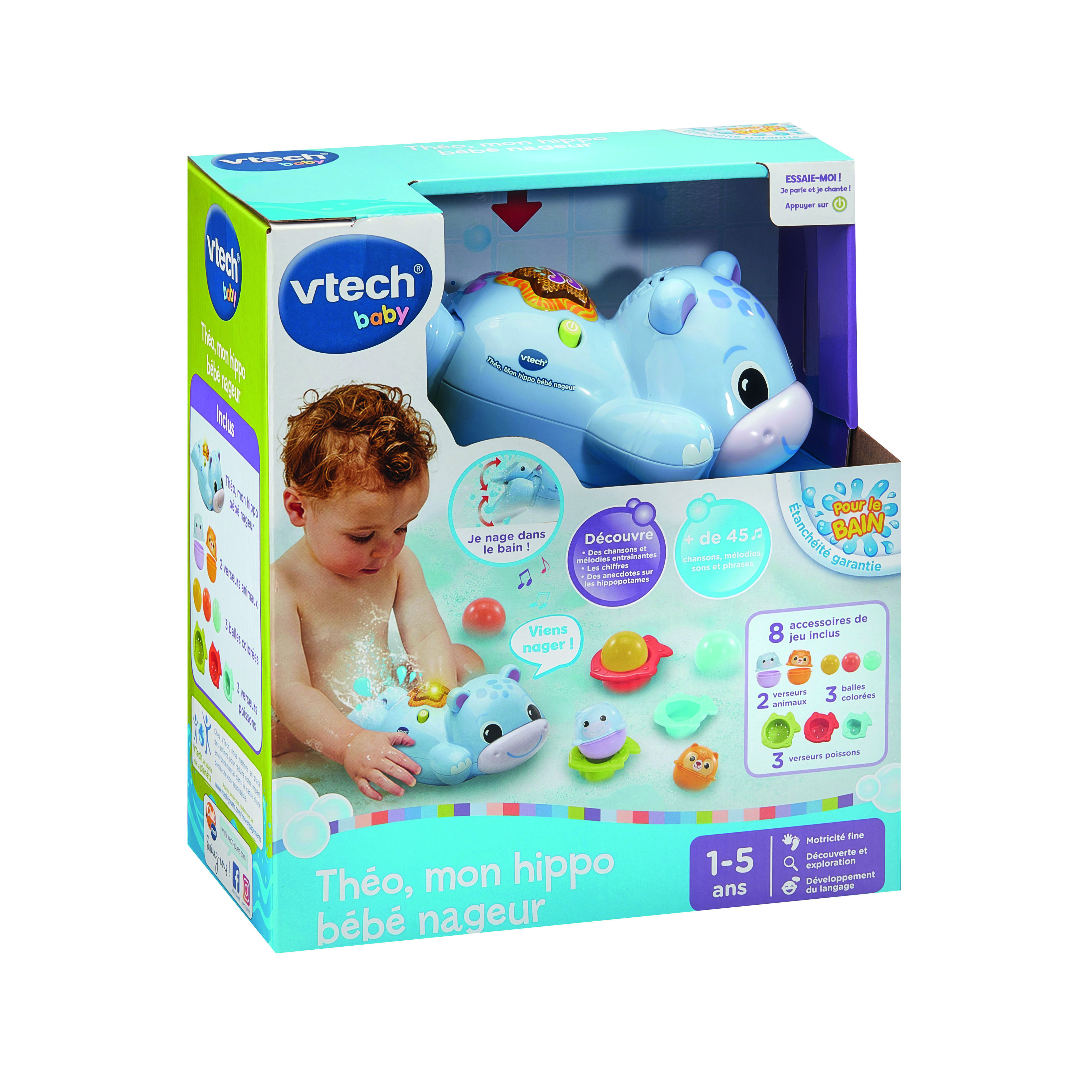 Théo, Mon hippo bébé nageur - 1 - 5 ans Théo, mon hippo bébé nageur accompagne les tout-petits au moment du bain pour les amuser et les éclabousser ! Dès que Bébé plonge Théo dans l’eau, l’adorable hippo se met à nager grâce à ses deux pattes arrières qui s’animent. Un capteur détecte lorsque le jouet est placé dans l’eau et active le mouvement de l’hippo tout en lui faisant découvrir des phrases et des sons amusants. Le Bouton Étoile de mer sur son dos s’illumine et déclenche de nombreuses interactions dès que Bébé appuie dessus. 3 chansons et 12 mélodies rythment le jeu. 8 accessoires de bain viennent compléter le jeu : 3 balles colorées, 3 verseurs poissons et 2 animaux avec projection d’eau. Arrêt automatique. Boîte Try-me. Fonctionne avec 3 piles LR03 fournies.
