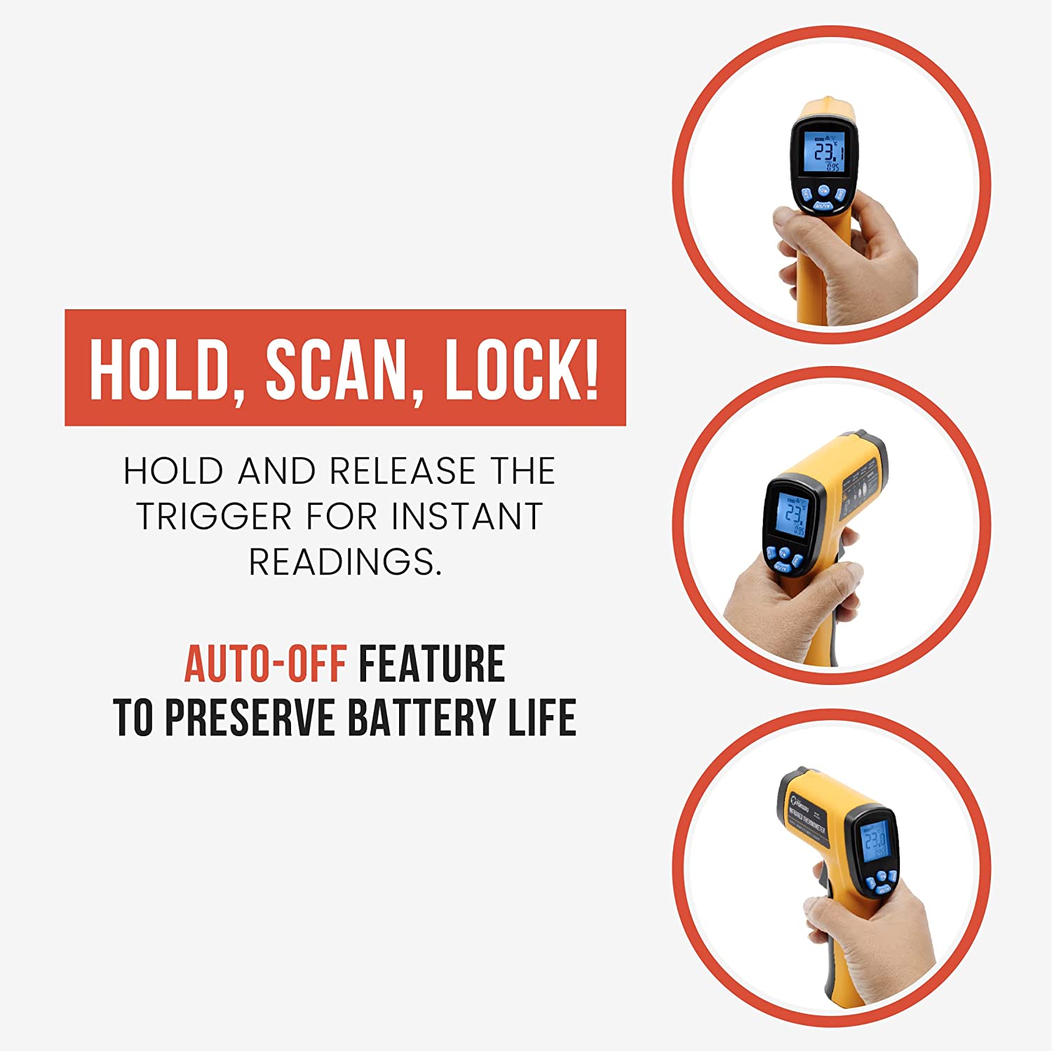 Pratique pour une utilisation intérieure et extérieure, le thermomètre infrarouge 550 vous permet de mesurer en toute sécurité les températures de surface à distance tout en conservant une précision laser. Mesurez des températures extrêmes allant de -58°F (-50°C) à 1022°F (550°C) sans jamais avoir besoin d'initier le contact. Utilisez le scanner de température infrarouge pour une large gamme d'applications, des composants électroniques internes aux températures de four. Avec une utilisation conviviale et une grande intervalle de mesures de température.