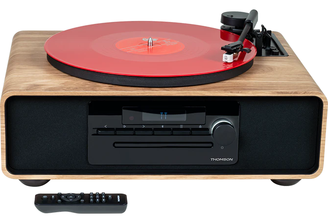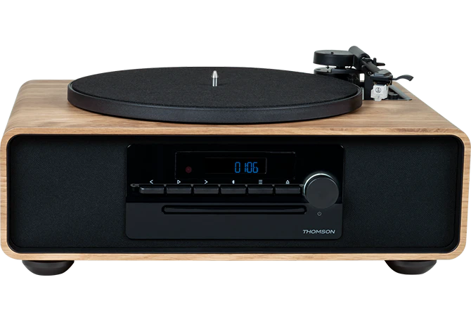 Libellé Thomson MIC300TT Micro Stéréo 60W Bluetooth 5.0 avec Platine Vinyle Intégrée - Lecteur CD, Radio FM, Lecteur USB (MP3) - Télécommande - Couleur Bois/