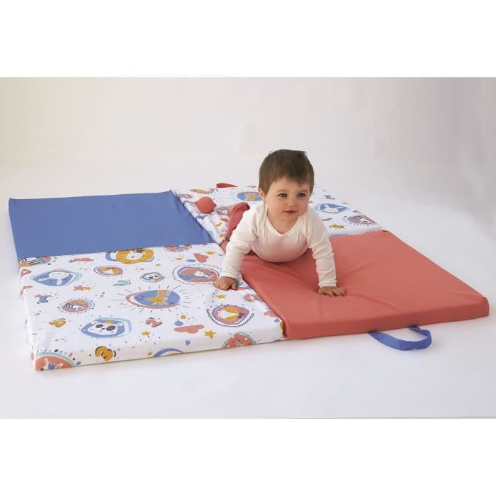 Le meilleur compagnon des heures de jeu de bébé ! Le tapis de motricité Candide offre une large surface d'éveil pour que bébé puisse jouer, s'allonger, s'asseoir et se retourner ! Une expérience unique pour le développement de bébé tout au long de sa croissance. ÉVOLUTIF 3 EN 1 : 1. Non plié, il offre un véritable tapis de motricité et d'éveil 2. Plié en 2, il devient un matelas d'appoint 3. Plié en 3, il se transforme en pouf pour un siege d'appoint et/ou pour ranger facilement le produit a la fin de la journée Parfait pour jouer en extérieur ! Le tapis de motricité vous accompagnera lors de vos sorties nature ou pique-niques en famille. Vous apprécierez sa base en PVC, imperméable et lavable. Caractéristiques : Tapis de motricité Non plié : 120 x 120 cm / Plié en 2 : 120 x 60 x 8 cm / Plié en 3 : 60 x 60 x 16 cm Housse lavable en machine Des la naissance