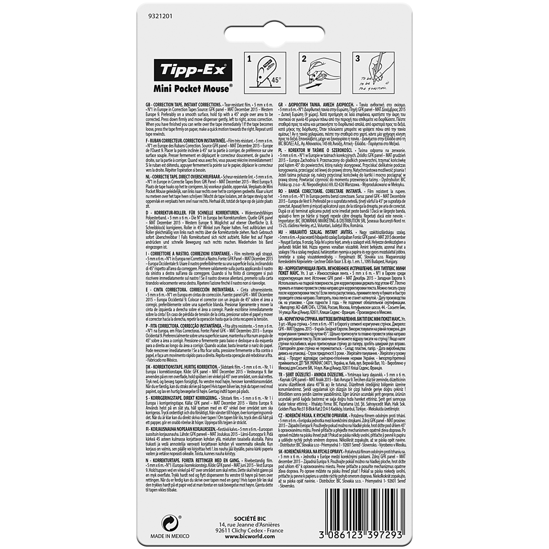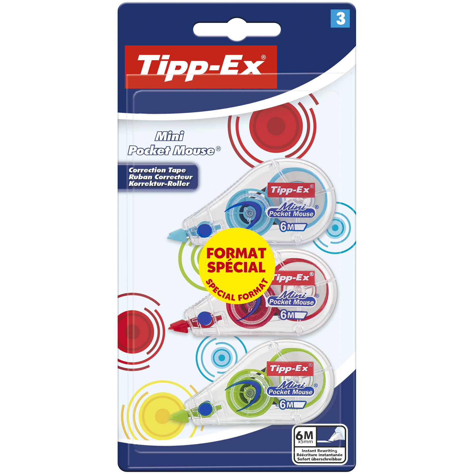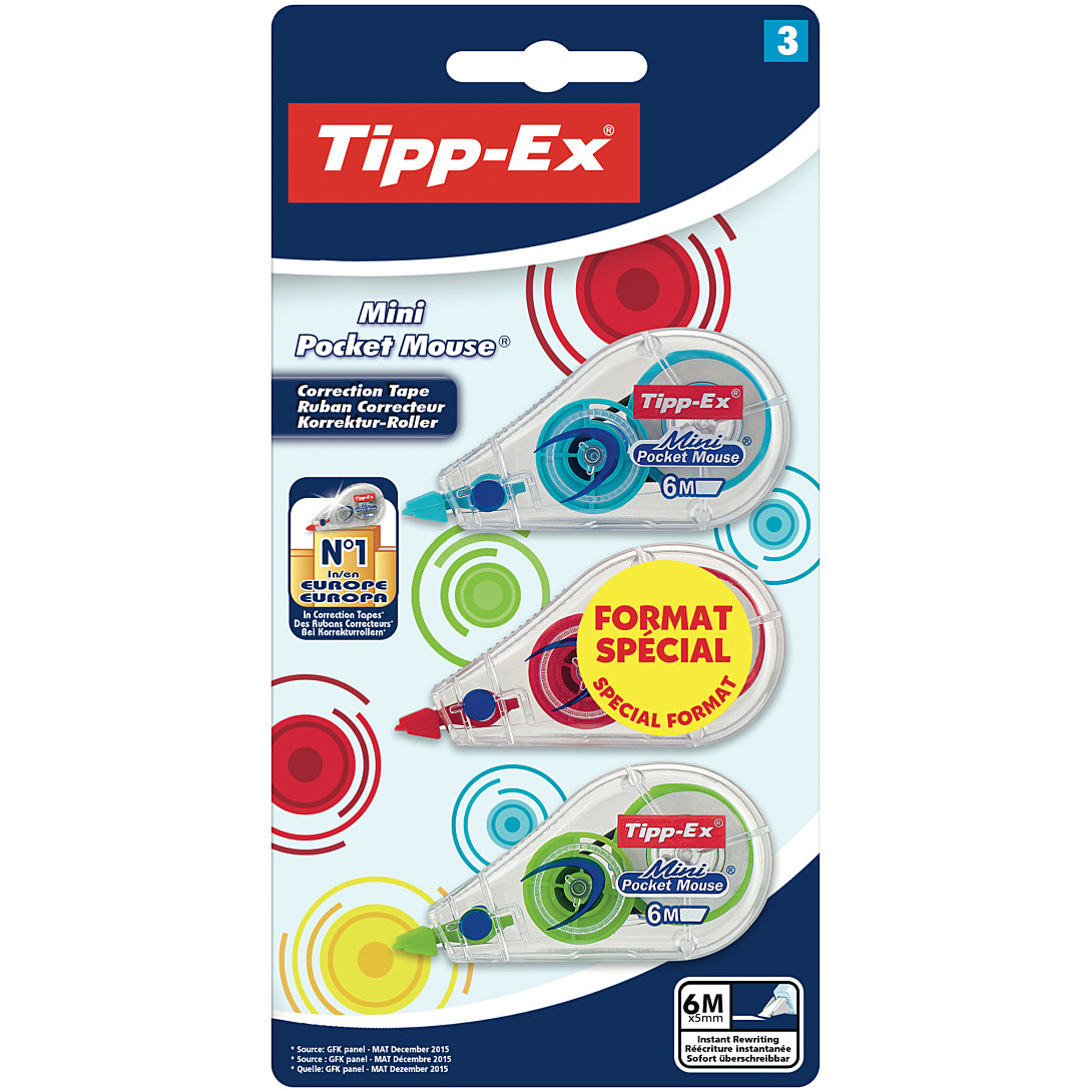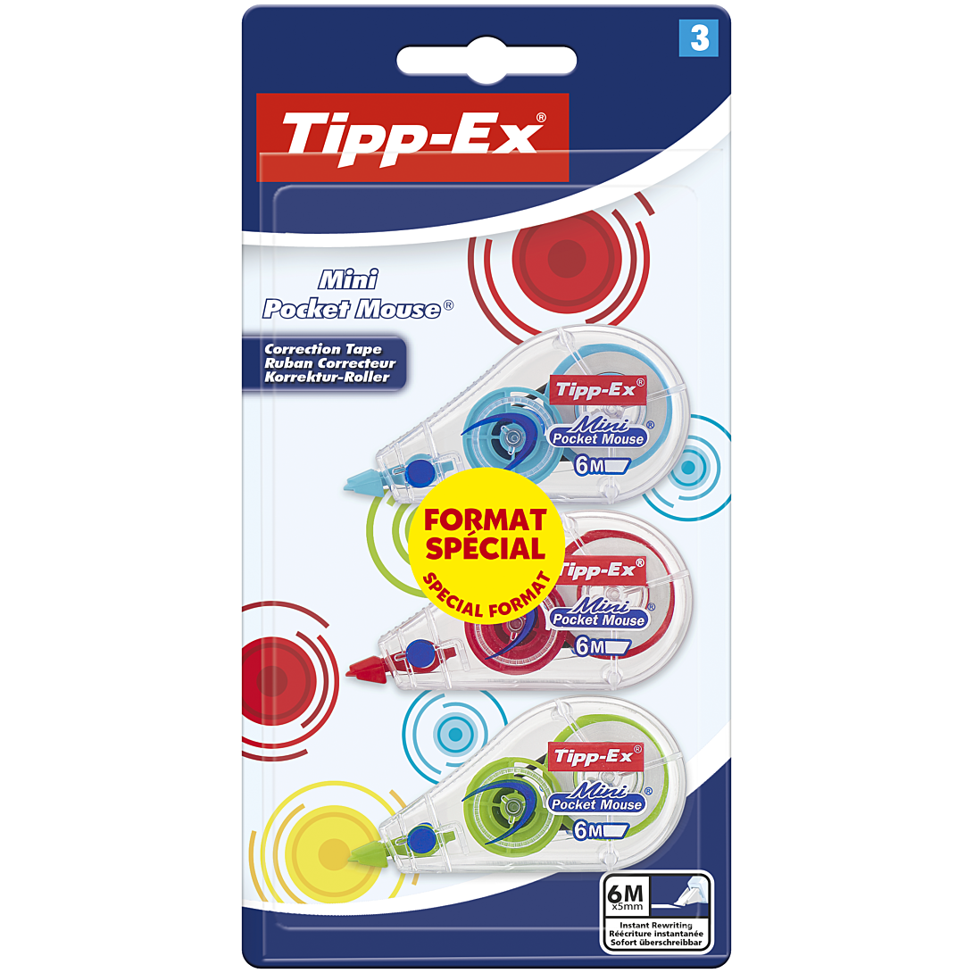 Ces 3 souris correctrices Tipp-Ex aux couleurs tendance s'habillent de rouge, vert, bleu ou jaune (aléatoire) mais elles corrigent encore et toujours en blanc. Compactes, ces souris Mini Pocket Mouse effacent jusqu'à 6 m d'erreurs. Corrigez sans attendre : une fois le ruban blanc appliqué sur le papier, vous pouvez immédiatement réécrire dessus.