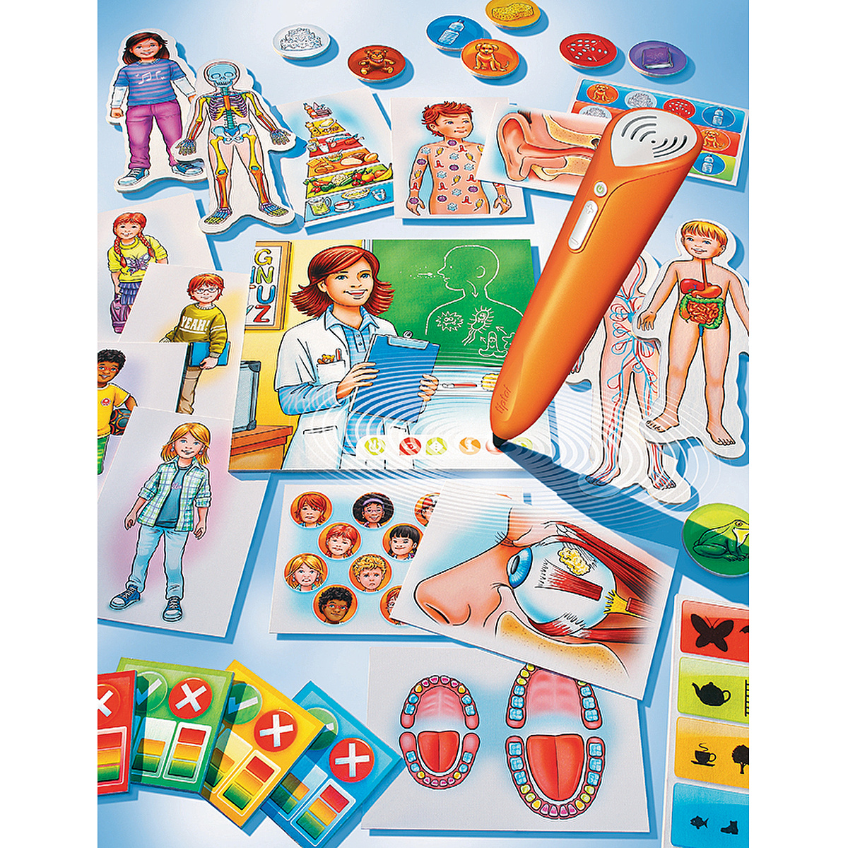Plus produit SANS ECRAN : tiptoi®, cest la promesse dun jeu éducatif interactif sans écran ! Comment ça marche ? il suffit à l\'enfant de pointer le lecteur sur une image ou un texte. Et comme par magie, il entendra des sons, des dialogues et des musiques. tiptoi® permet aux enfants dapprendre en samusant en proposant un contenu riche, varié et de qualité. DECOUVERTE : pars à la rencontre de l\'infirmière Lisa, elle t\'apprendra tout sur le corps humain. En passant par différents thèmes tels que l\'anatomie, la santé, l\'alimentation ou encore l\'humeur. Joue à de nombreux jeux au cur du corps humain et remporte les défis pour être le meilleur ! Ce jeu fonctionne uniquement avec le lecteur tiptoi® +PRODUIT : tiptoi® promet à votre enfant des heures de découverte et dapprentissage en toute autonomie. Le coffret de jeu est un format facile à ranger et permet de défier vos amis, basé sur l\'apprentissage du corps humain. Le lecteur possède même une prise casque ! Le volume sonore est réglable. Le tout pour un contenu éducatif sans écran ! EVOLUTIF : une fois équipé du lecteur tiptoi®, votre enfant peut découvrir dautres thématiques qui le passionnent de 3 à 10 ans : les dinosaures, les bébés animaux ou la forêt... Il existe une large collection de livres, jeux et globe, tous compatibles avec le lecteur tiptoi®. CONTENU : 14 planches \'Enfant\', 4 planches \'Anatomie\', 4 plaquettes \'Joueur\', 8 jetons de couleur, 1 planche de test visuel, 1 tableau de bord, 1 notice. Ce jeu interactif fonctionne avec le lecteur tiptoi® et nécessite le téléchargement gratuit du fichier audio sur le site internet Ravensburger ou sur linterface tiptoi® manager.