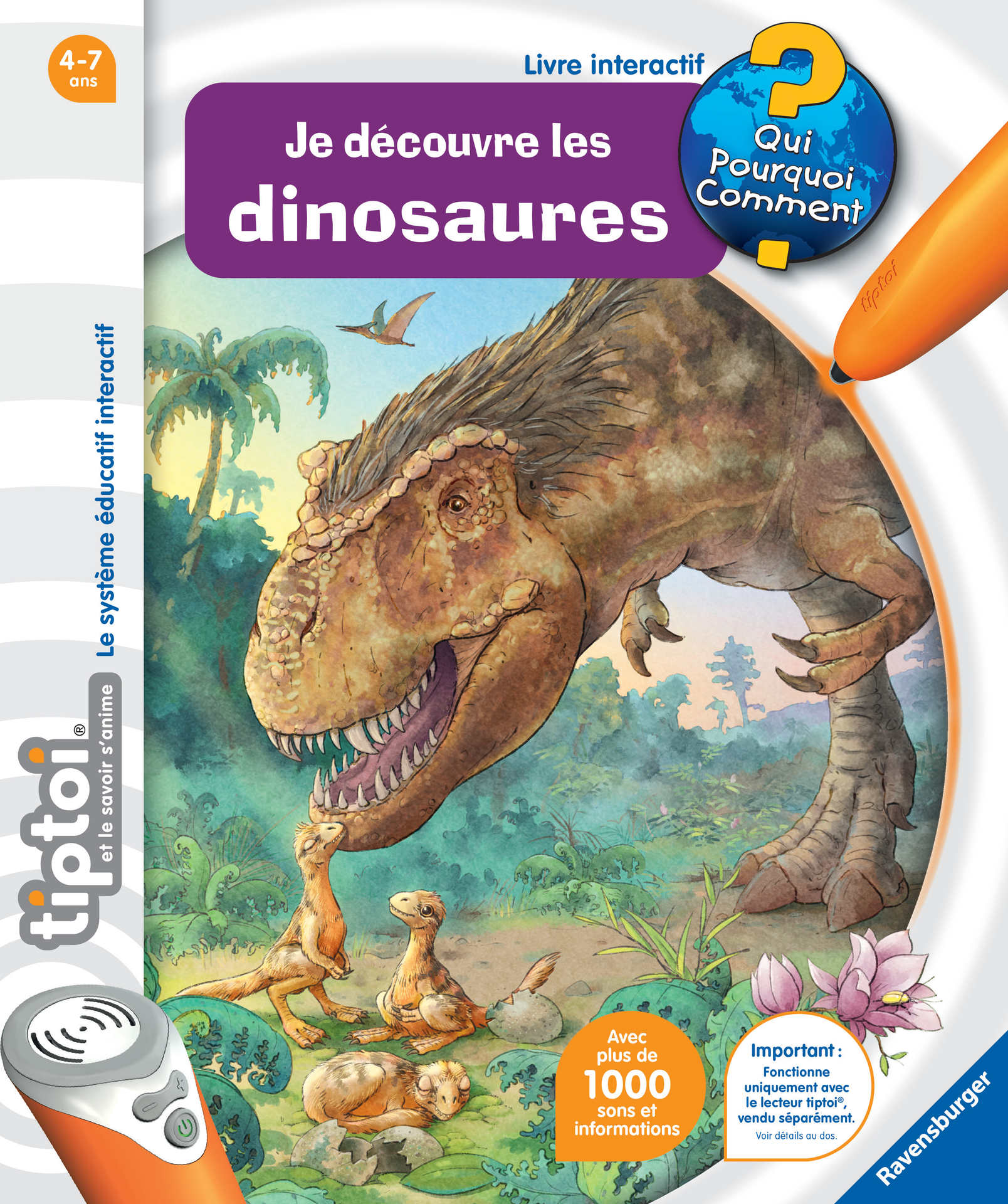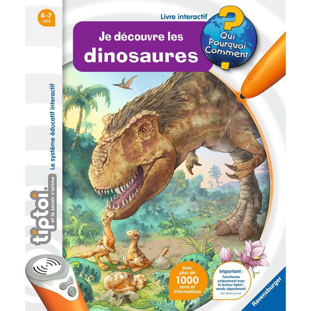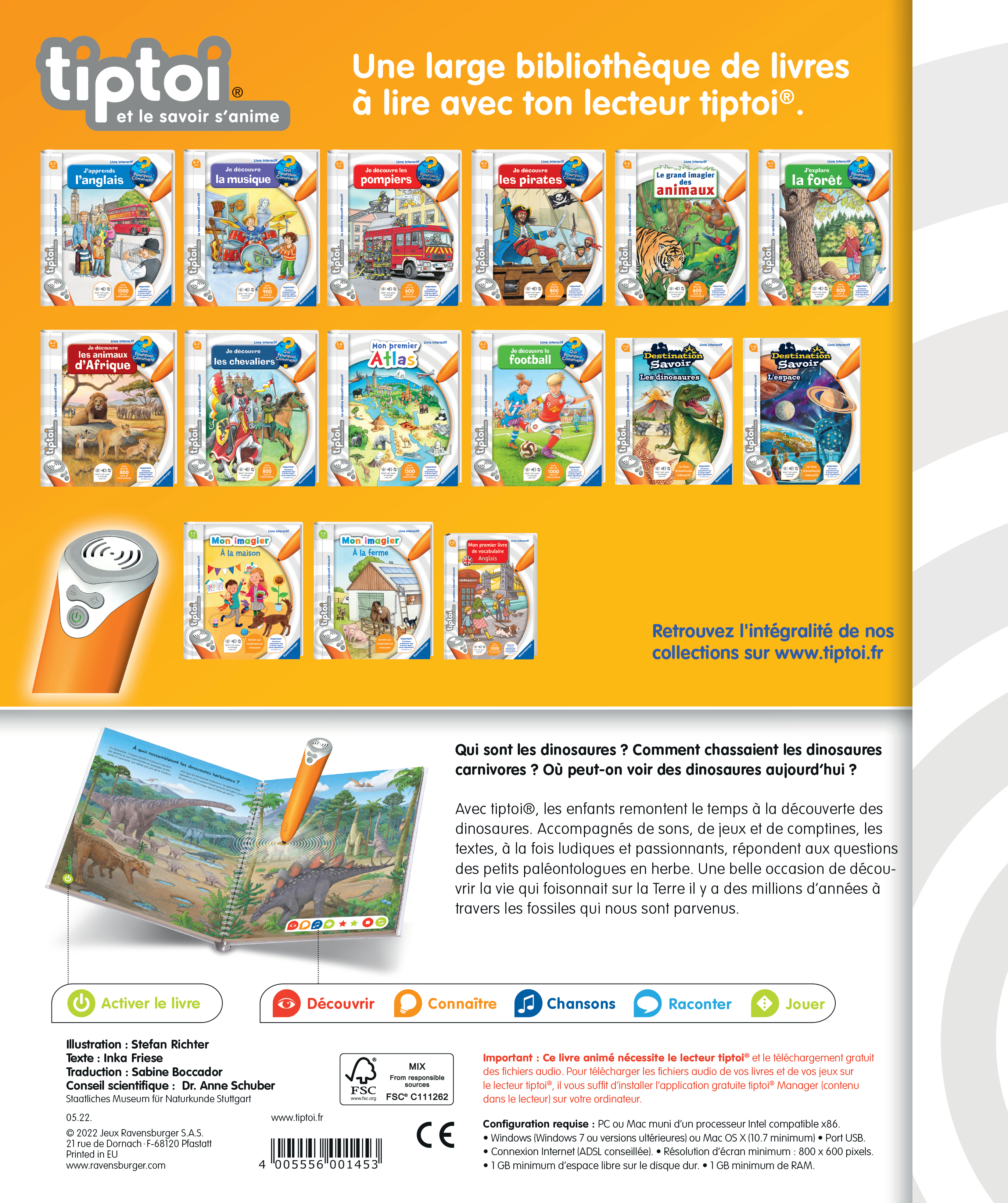 | Plus produit | SANS ECRAN : tiptoi®, cest la promesse dun jeu éducatif interactif sans écran ! Comment ça marche ? il suffit à l\'enfant de pointer le lecteur sur une image ou un texte. Et comme par magie, il entendra des sons, des dialogues et des musiques. tiptoi® permet aux enfants dapprendre en samusant en proposant un contenu riche, varié et de qualité. DECOUVERTE : plonge dans l\'ère des grands dinosaures ! Tu découvriras les différentes espèces qui peuplaient la Terre il y a des millions d\'années. A l\'aide des fossiles, des squelettes et de plus de 1000 sons, histoires et chansons votre enfant deviendra un véritable apprenti paléontologue ! Ce livre fonctionne uniquement avec le lecteur tiptoi®. +PRODUIT : tiptoi® promet à votre enfant des heures de découverte et dapprentissage en toute autonomie sur des contenus riches et variés. Très facile à emporter partout, le lecteur possède même une prise casque ! Le volume sonore est réglable. Le tout pour un contenu éducatif sans écran ! EVOLUTIF : une fois équipé du lecteur tiptoi®, votre enfant peut découvrir dautres thématiques qui le passionnent et adaptées de 3 à 10 ans : les chevaliers, les bébés animaux ou l\'anglais... Il existe une large collection de livres, jeux et globe, tous compatibles avec le lecteur tiptoi®. INTERACTIF : Livre \'Je découvre les dinosaures\', 16 pages. Ce livre interactif fonctionne uniquement avec le lecteur tiptoi® et nécessite le téléchargement gratuit du fichier audio sur le site internet Ravensburger ou sur linterface tiptoi® manager. Lecteur tiptoi® vendu séparément ! |