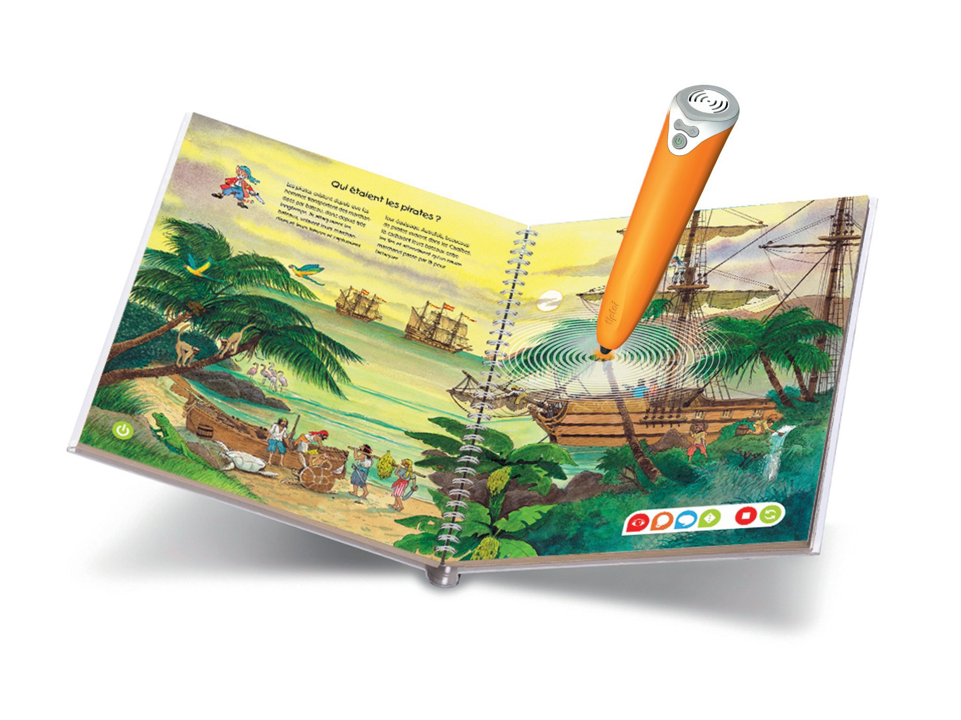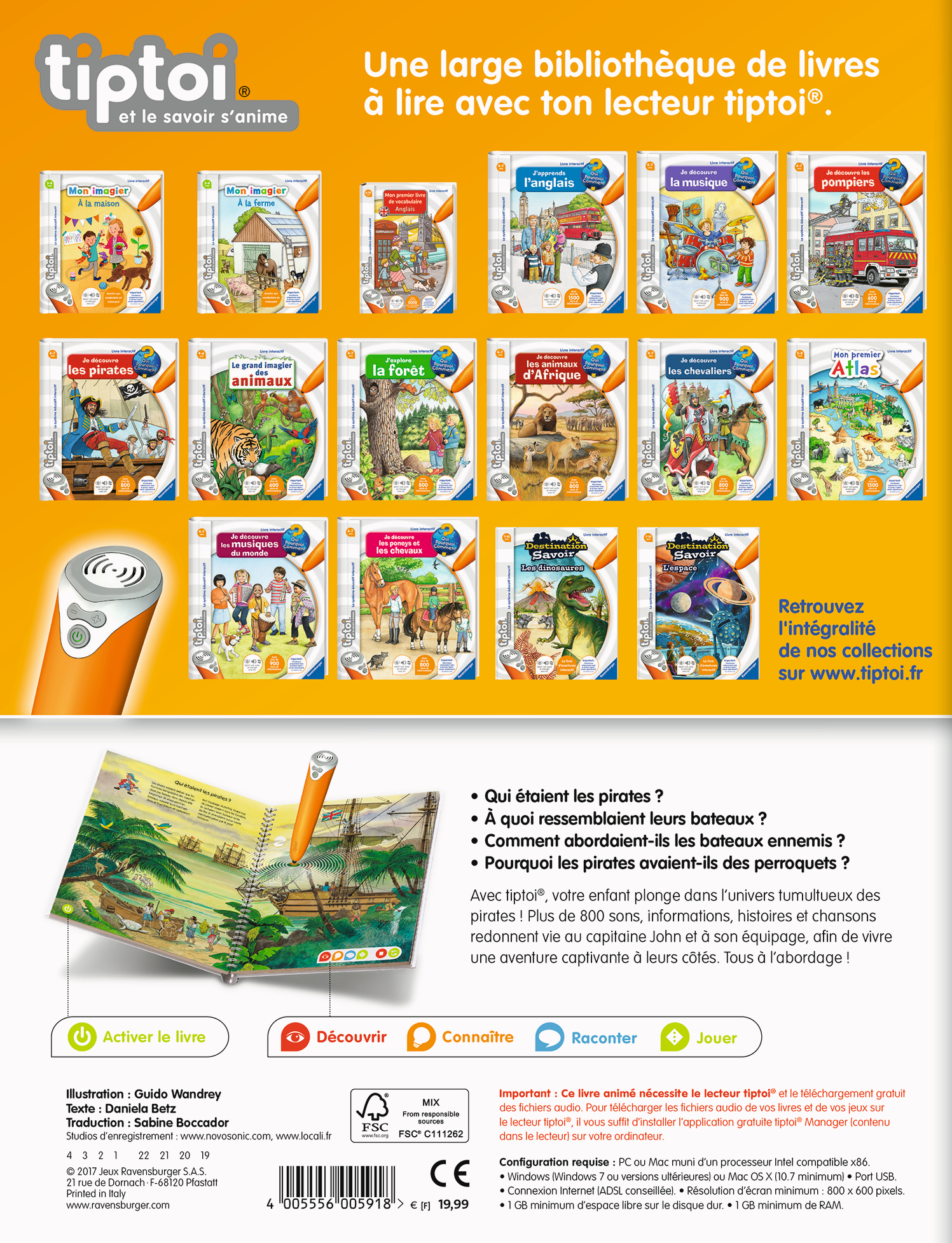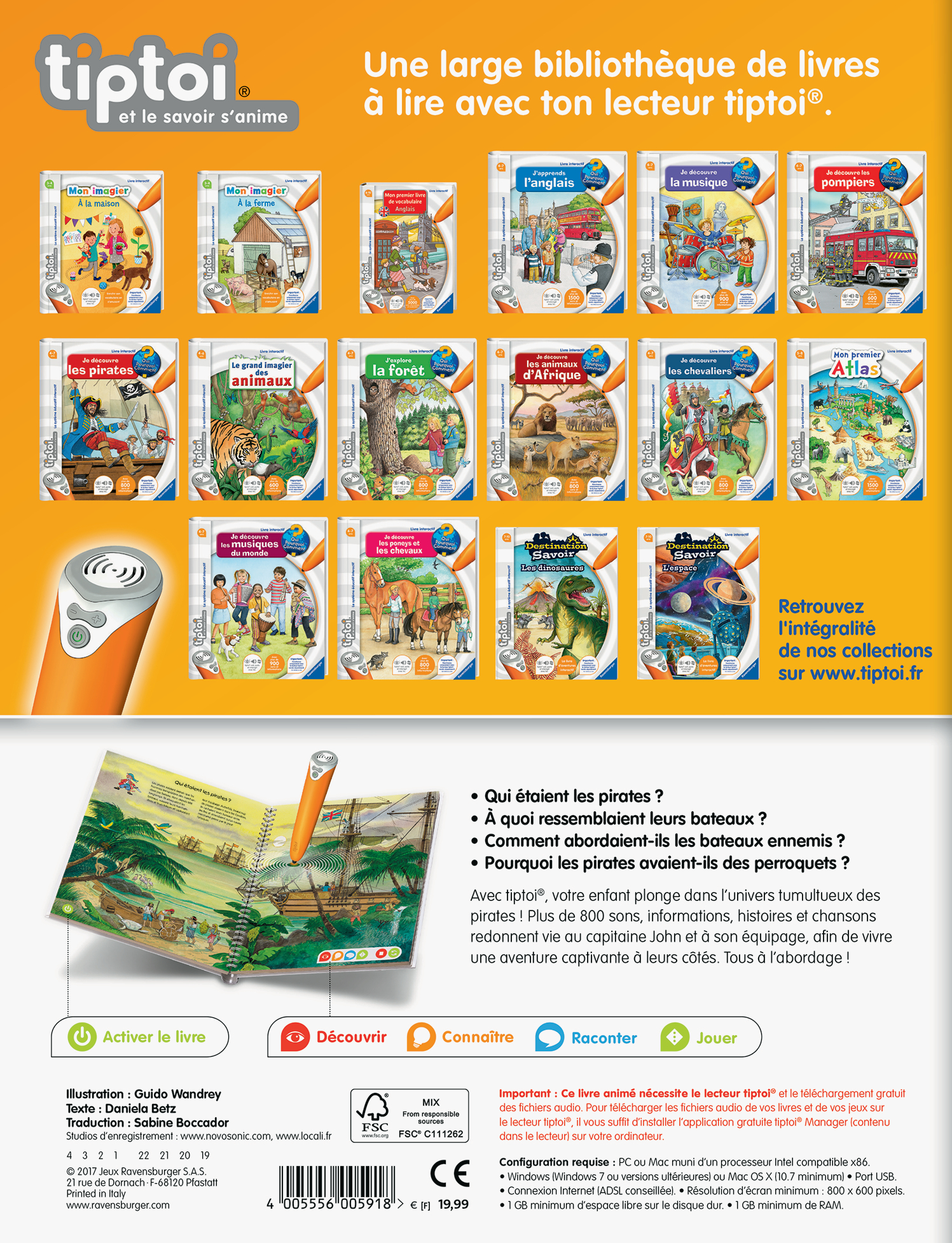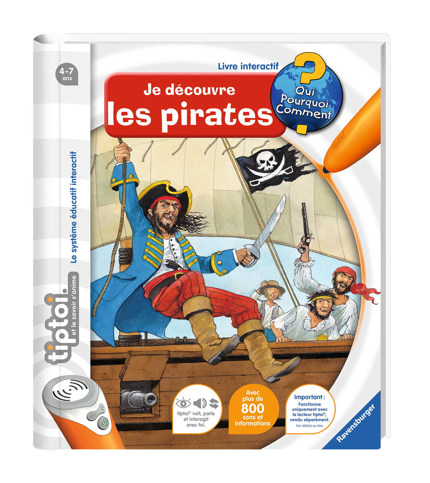 | Plus produit | SANS ECRAN : tiptoi®, cest la promesse dun jeu éducatif interactif sans écran ! Comment ça marche ? il suffit à l\'enfant de pointer le lecteur sur une image ou un texte. Et comme par magie, il entendra des sons, des dialogues et des musiques. tiptoi® permet aux enfants dapprendre en samusant en proposant un contenu riche, varié et de qualité. DECOUVERTE : Tous à labordage ! Tu vas découvrir avec le capitaine John et son équipage., l\'univers tumultueux des pirates. Qui devenait pirate ? Comment se passait un abordage ? Alors moussaillon es-tu prêt à conquerir l\'océan ! Ce livre fonctionne uniquement avec le lecteur tiptoi® +PRODUIT : tiptoi® promet à votre enfant des heures de découverte et dapprentissage en toute autonomie sur des contenus riches et variés. Très facile à emporter partout, le lecteur possède même une prise casque ! Le volume sonore est réglable. Le tout pour un contenu éducatif sans écran ! EVOLUTIF : une fois équipé du lecteur tiptoi®, votre enfant peut découvrir dautres thématiques qui le passionnent et adaptées de 3 à 10 ans : le corps humain, le football ou les pompiers... Il existe une large collection de livres, jeux et globe, tous compatibles avec le lecteur tiptoi®. INTERACTIF : Livre \'Je découvre les pirates\', 16 pages. Ce livre interactif fonctionne uniquement avec le lecteur tiptoi® et nécessite le téléchargement gratuit du fichier audio sur le site internet Ravensburger ou sur linterface tiptoi® manager. Lecteur tiptoi® vendu séparément ! |
