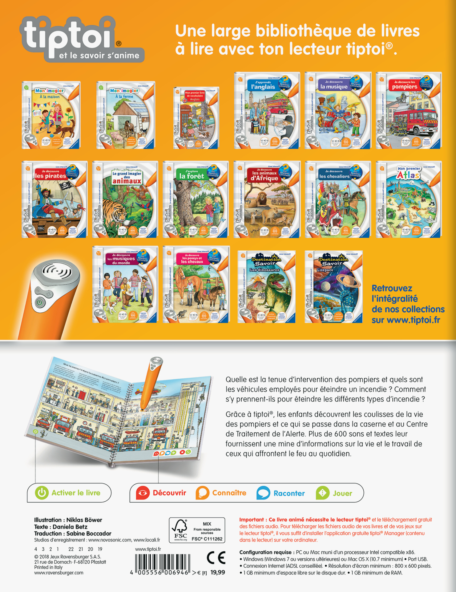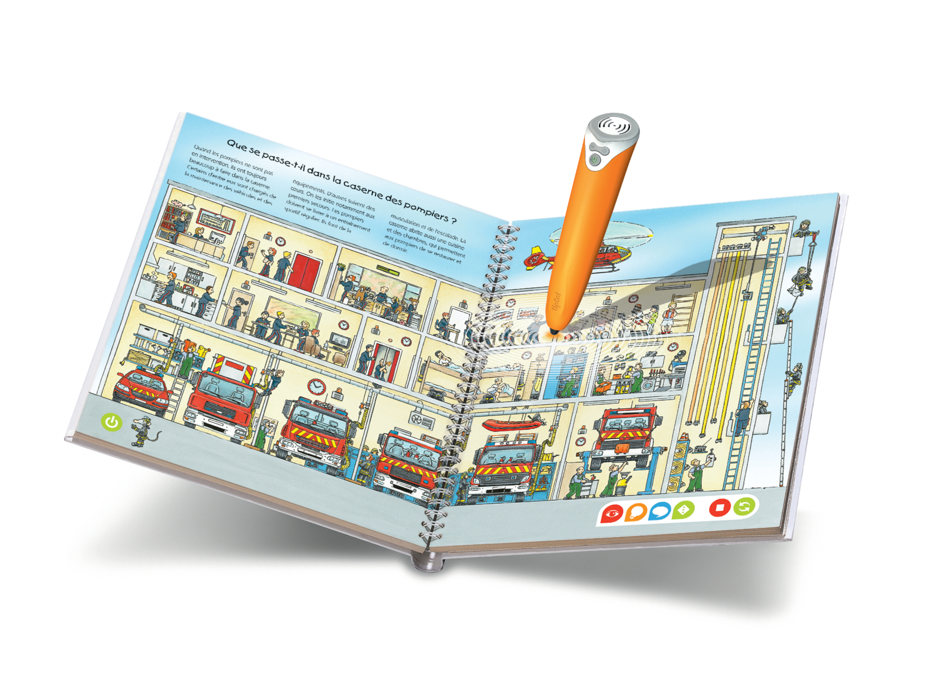 | Plus produit | SANS ECRAN : tiptoi®, cest la promesse dun jeu éducatif interactif sans écran ! Comment ça marche ? il suffit à l\'enfant de pointer le lecteur sur une image ou un texte. Et comme par magie, il entendra des sons, des dialogues et des musiques. tiptoi® permet aux enfants dapprendre en samusant en proposant un contenu riche, varié et de qualité. DECOUVERTE : plonge dans les coulisses d\'une caserne et l\'univers des pompiers n\'aura plus de secret pour toi ! Quels sont les véhicules d\'intervention ? Comment et quand appeler les pompiers ? Tu vas vivre une aventure captivante au cur de l\'action pour devenir un apprenti sapeur pompier ! Ce livre fonctionne uniquement avec le lecteur tiptoi®. +PRODUIT : tiptoi® promet à votre enfant des heures de découverte et dapprentissage en toute autonomie sur des contenus riches et variés. Très facile à emporter partout, le lecteur possède même une prise casque ! Le volume sonore est réglable. Le tout pour un contenu éducatif sans écran ! EVOLUTIF : une fois équipé du lecteur tiptoi®, votre enfant peut découvrir dautres thématiques qui le passionnent de 3 à 10 ans : le corps humain, les chevaliers ou les pirates... Il existe une large collection de livres, jeux et globe, tous compatibles avec le lecteur tiptoi®. INTERACTIF : Livre \'Je découvre les pompiers\', 16 pages. Ce livre interactif fonctionne uniquement avec le lecteur tiptoi® et nécessite le téléchargement gratuit du fichier audio sur le site internet Ravensburger ou sur linterface tiptoi® manager. Lecteur tiptoi® vendu séparément ! |