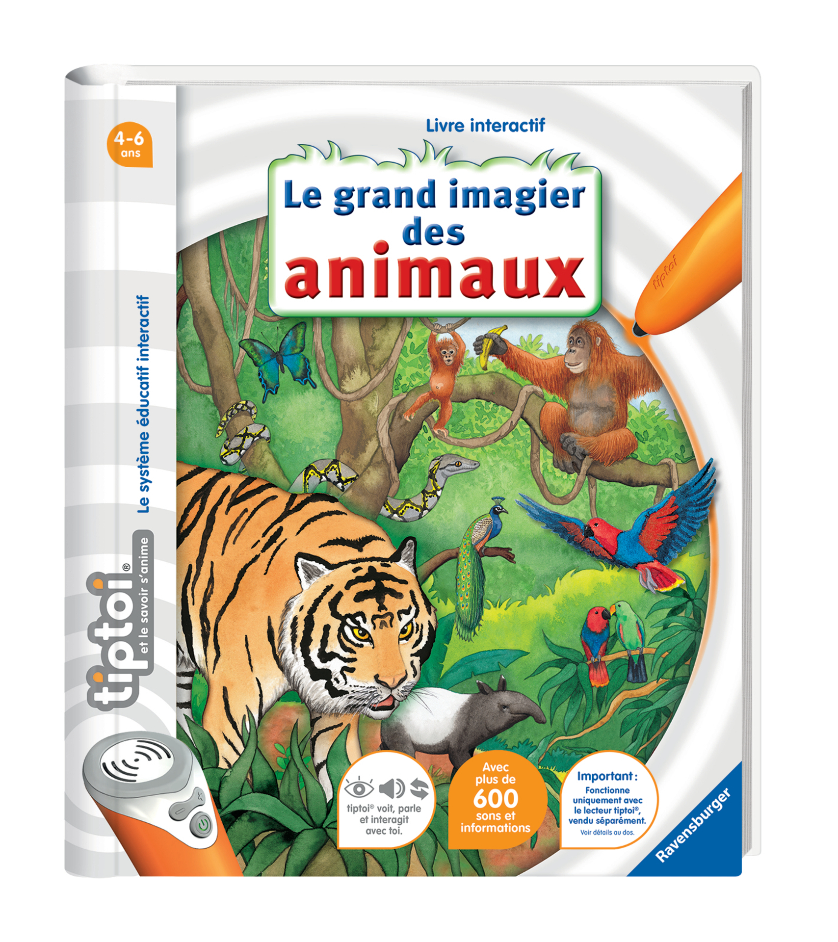 Plus produit SANS ECRAN : tiptoi®, cest la promesse dun jeu éducatif interactif sans écran ! Comment ça marche ? il suffit à l\'enfant de pointer le lecteur sur une image ou un texte. Et comme par magie, il entendra des sons, des dialogues et des musiques. tiptoi® permet aux enfants dapprendre en samusant en proposant un contenu riche, varié et de qualité. DECOUVERTE : pars à la rencontre des animaux dans les plus beaux paysages. En passant par la forêt, la montage, les lacs, la jungle, la savane et la mer. Une vraie mine d\'or pour connaitre tous les animaux et devenir un véritable expert dans le domaine de la faune et de la flore ! Ce livre fonctionne uniquement avec le lecteur tiptoi®. +PRODUIT : tiptoi® promet à votre enfant des heures de découverte et dapprentissage en toute autonomie sur des contenus riches et variés. Très facile à emporter partout, le lecteur possède même une prise casque ! Le volume sonore est réglable. Le tout pour un contenu éducatif sans écran ! EVOLUTIF : une fois équipé du lecteur tiptoi®, votre enfant peut découvrir dautres thématiques qui le passionnent et adaptées de 3 à 10 ans : les pompiers, les bébés animaux ou le corps humain... Il existe une large collection de livres, jeux et globe, tous compatibles avec le lecteur tiptoi®. INTERACTIF : Livre \'Le grand imagier des animaux\', 16 pages. Ce livre interactif fonctionne uniquement avec le lecteur tiptoi® et nécessite le téléchargement gratuit du fichier audio sur le site internet Ravensburger ou sur linterface tiptoi® manager. Lecteur tiptoi® vendu séparément !