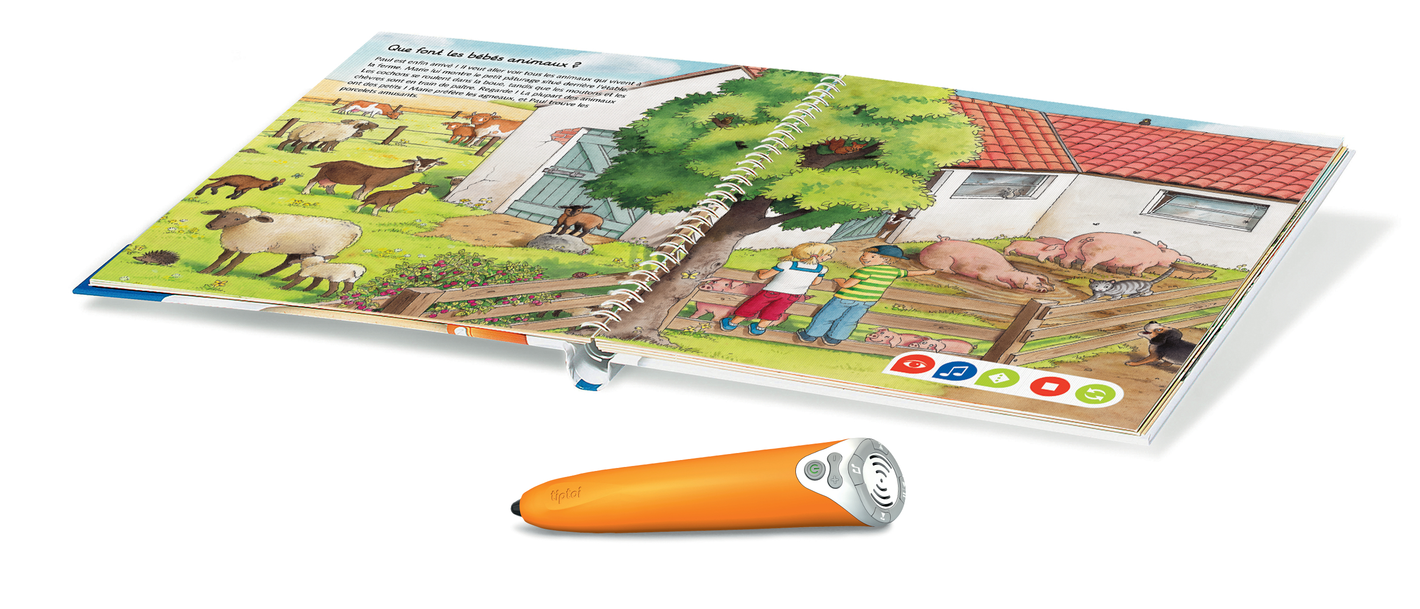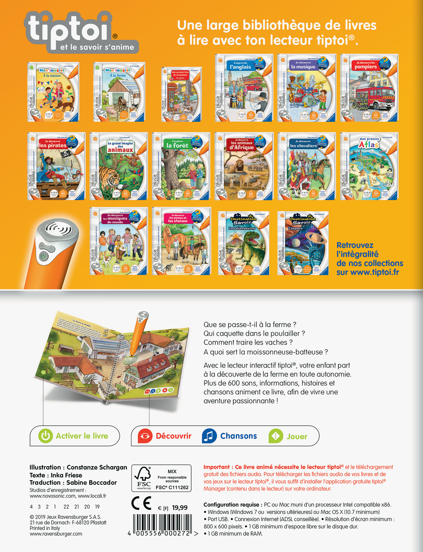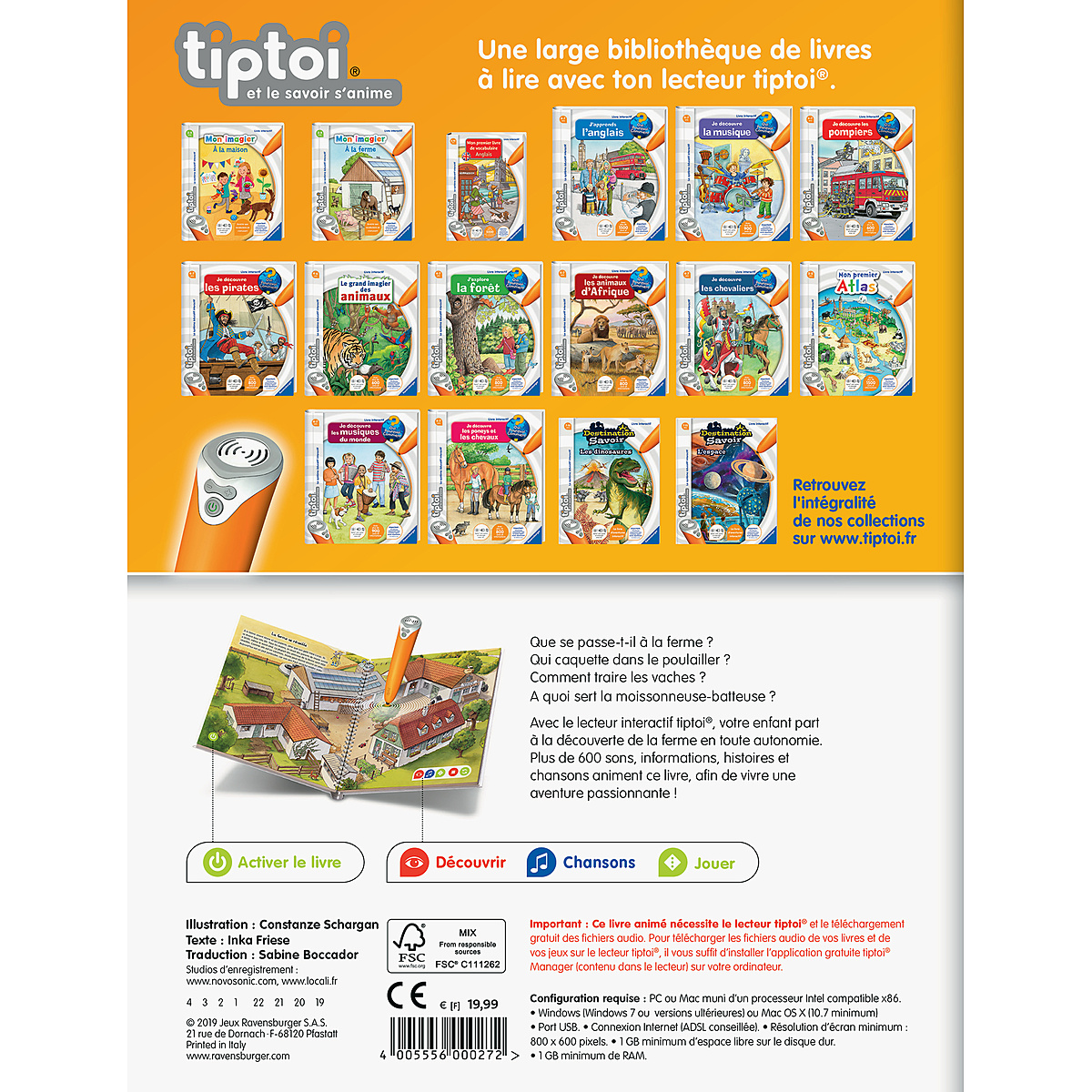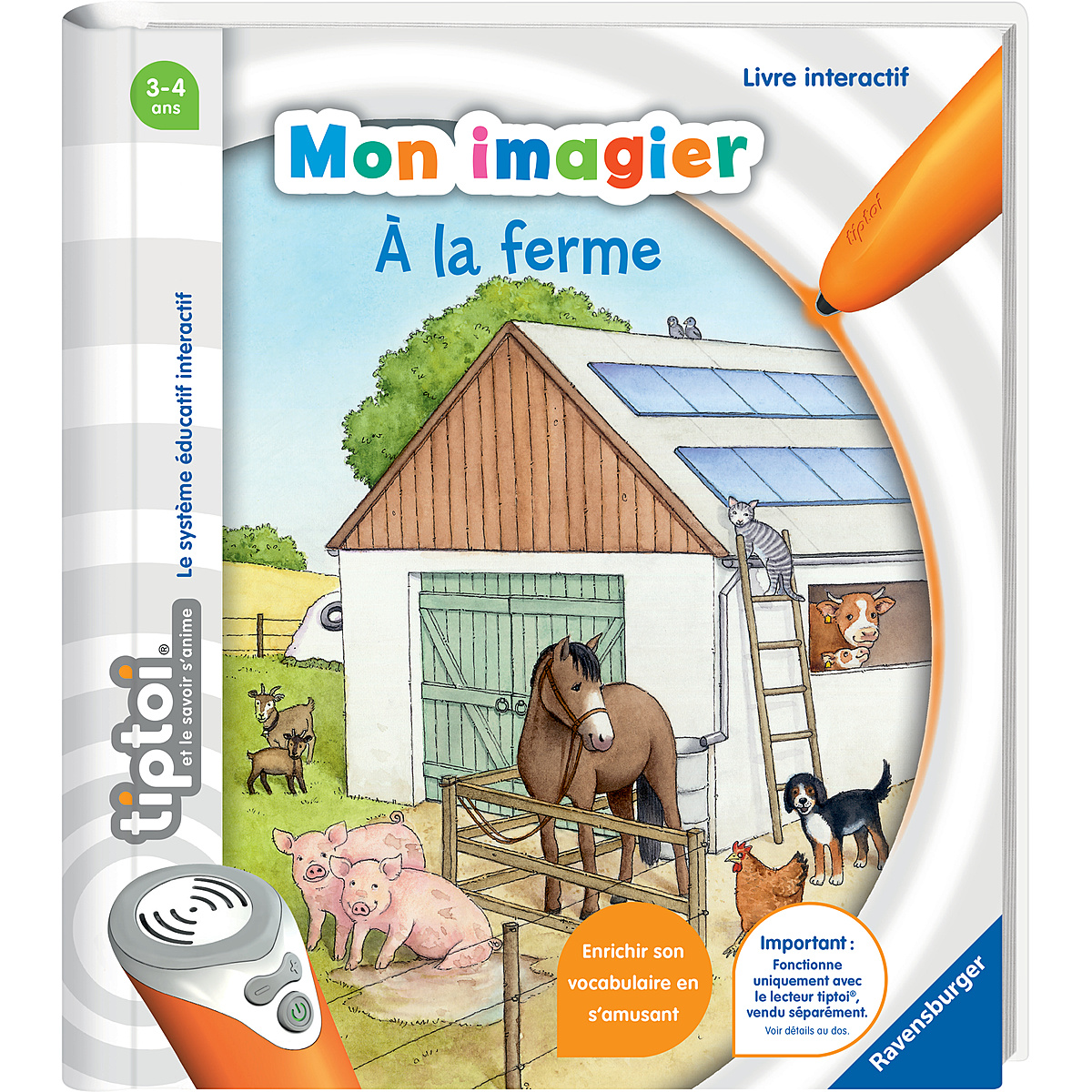 | Plus produit | SANS ECRAN : tiptoi®, cest la promesse dun jeu éducatif interactif sans écran ! Comment ça marche ? il suffit à l\'enfant de pointer le lecteur sur une image ou un texte. Et comme par magie, il entendra des sons, des dialogues et des musiques. tiptoi® permet aux enfants dapprendre en samusant en proposant un contenu riche, varié et de qualité. DECOUVERTE : Enfile tes bottes et rejoins Marie et Paul pour une visite à la ferme. Pendant cette aventure tu découvriras les animaux de la ferme, la traite des vaches, le poulailler et de nombreux autres sujets. Alors viens vite découvrir les joies de la ferme pour devenir un petit fermier. Ce livre fonctionne uniquement avec le lecteur tiptoi®. +PRODUIT : tiptoi® promet à votre enfant des heures de découverte et dapprentissage en toute autonomie sur des contenus riches et variés. Très facile à emporter partout, le lecteur possède même une prise casque ! Le volume sonore est réglable. Le tout pour un contenu éducatif sans écran ! EVOLUTIF : une fois équipé du lecteur tiptoi®, votre enfant peut découvrir dautres thématiques qui le passionnent de 3 à 10 ans : la maison, les bébés animaux ou la forêt... Il existe une large collection de livres, jeux et globe, tous compatibles avec le lecteur tiptoi®. INTERACTIF : Livre \'Mon imagier à la ferme\', 12 pages. Ce livre interactif fonctionne uniquement avec le lecteur tiptoi® et nécessite le téléchargement gratuit du fichier audio sur le site internet Ravensburger ou sur linterface tiptoi® manager. Lecteur tiptoi® vendu séparément ! |