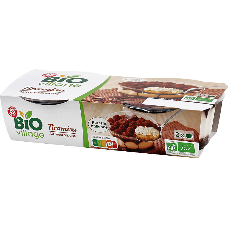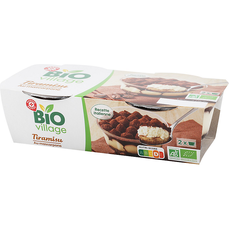 Dessert pâtissier à base de préparation au mascarpone, sauce au café, génoise et décor au cacao - Produit issu de l'agriculture biologique BIO VILLAGE