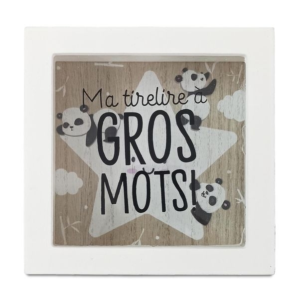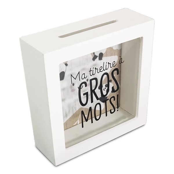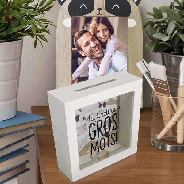 Pour obtenir de l'argent de poche, cette tirelire à gros mots est ultra pratique pour taxer les membres de votre famille qui disent des gros mots. A chaque gros mots prononcé, la personne y glisser une pièce.* Dimensions : 15 x 15 x 5 cm * Matière : bois * Couleur : blanc, bois * Tirelire * Fente sur le dessus * Ouverture à l'arrière à la manière d'un cadre Fonctions : tirelire Contenu : 1 tirelire anti gros mots