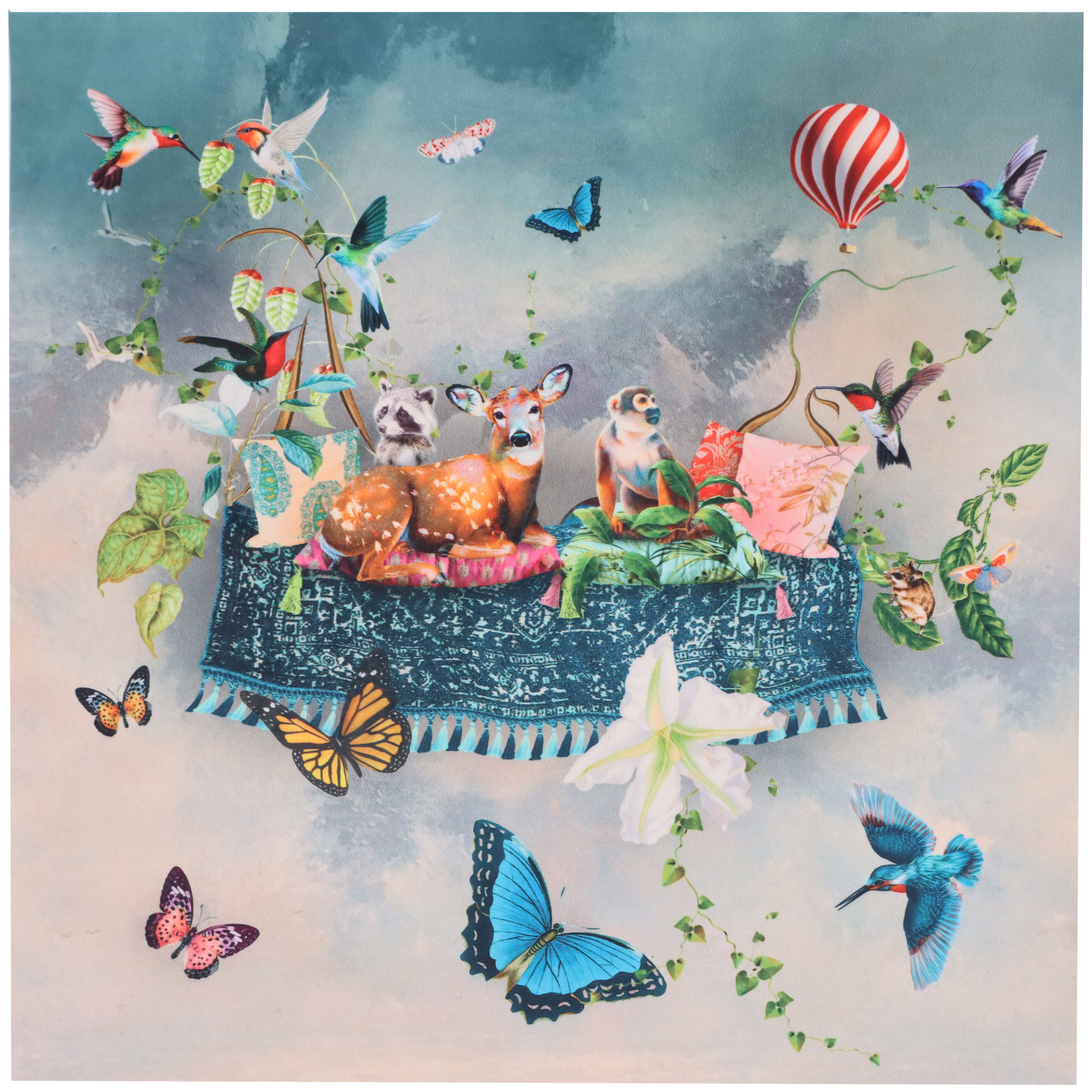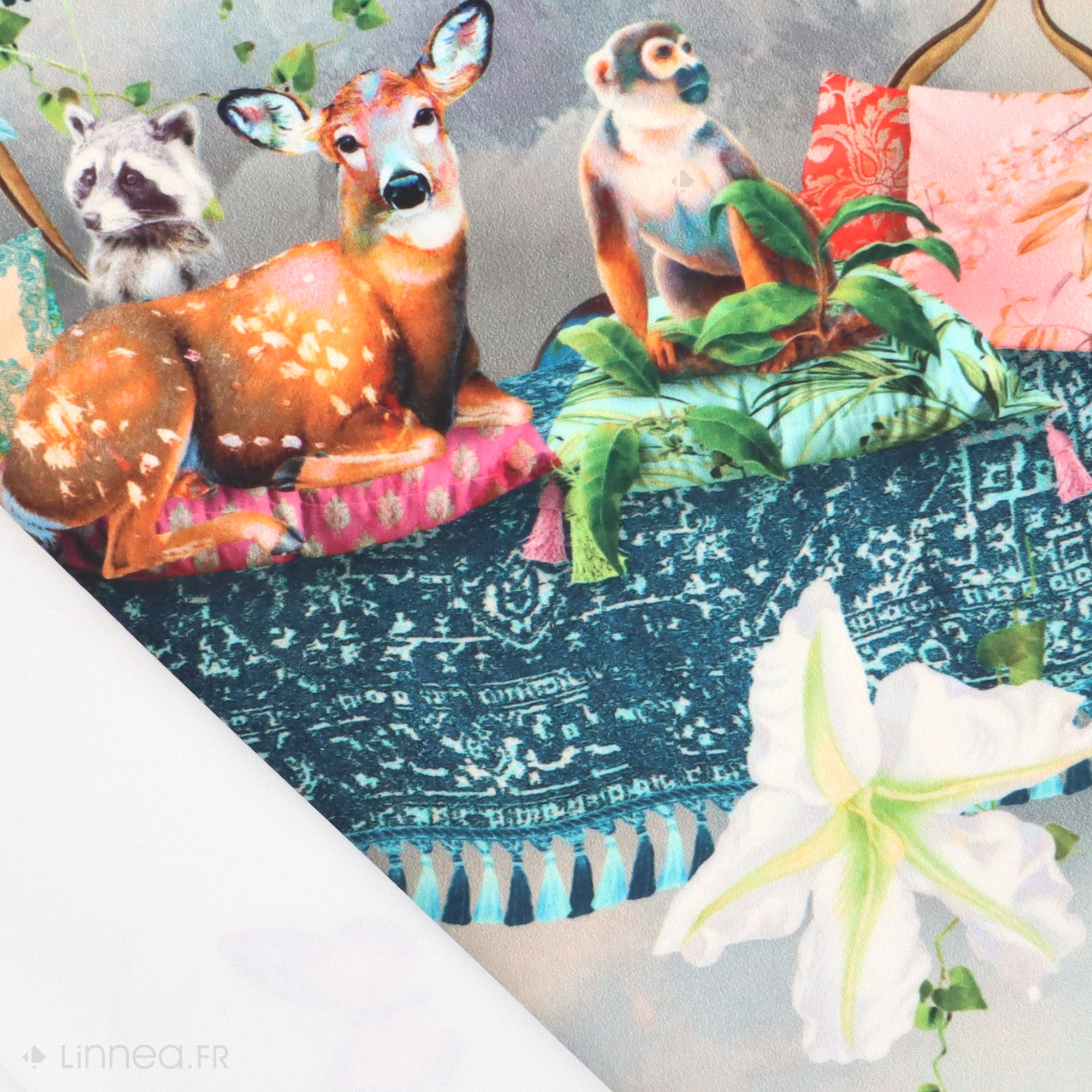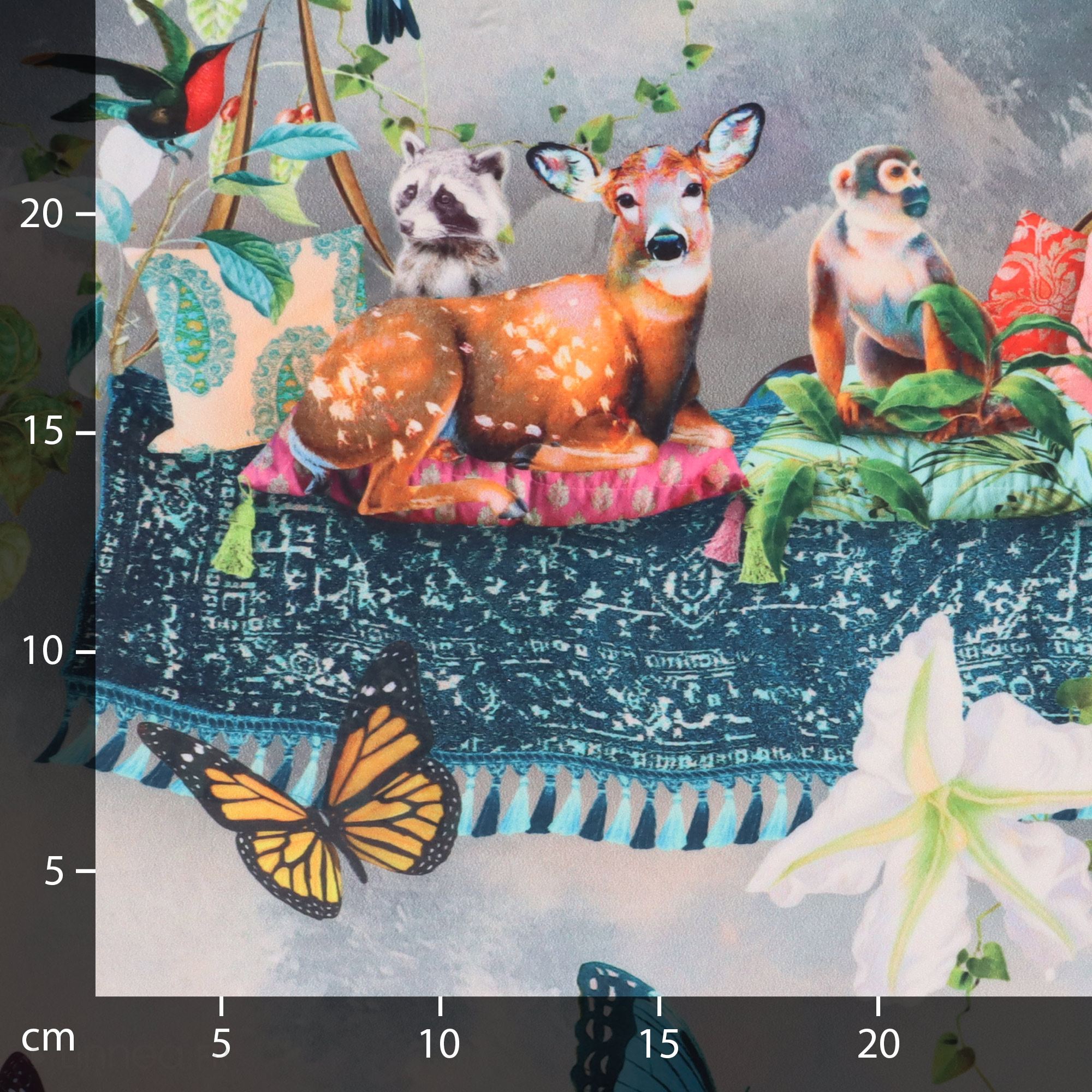 Tissu carré velours avec un motif qui met en scène une biche et un singe sur un tapis volant au milieu d'oiseaux et papillons dans des tons de gris craie.