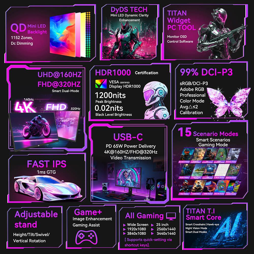 TITAN ARMY P275MV PLUS Écran plat 16:9 Fast IPS UHD 160 Hz Double mode FHD 320H 1152 Mini LED Gaming Moni