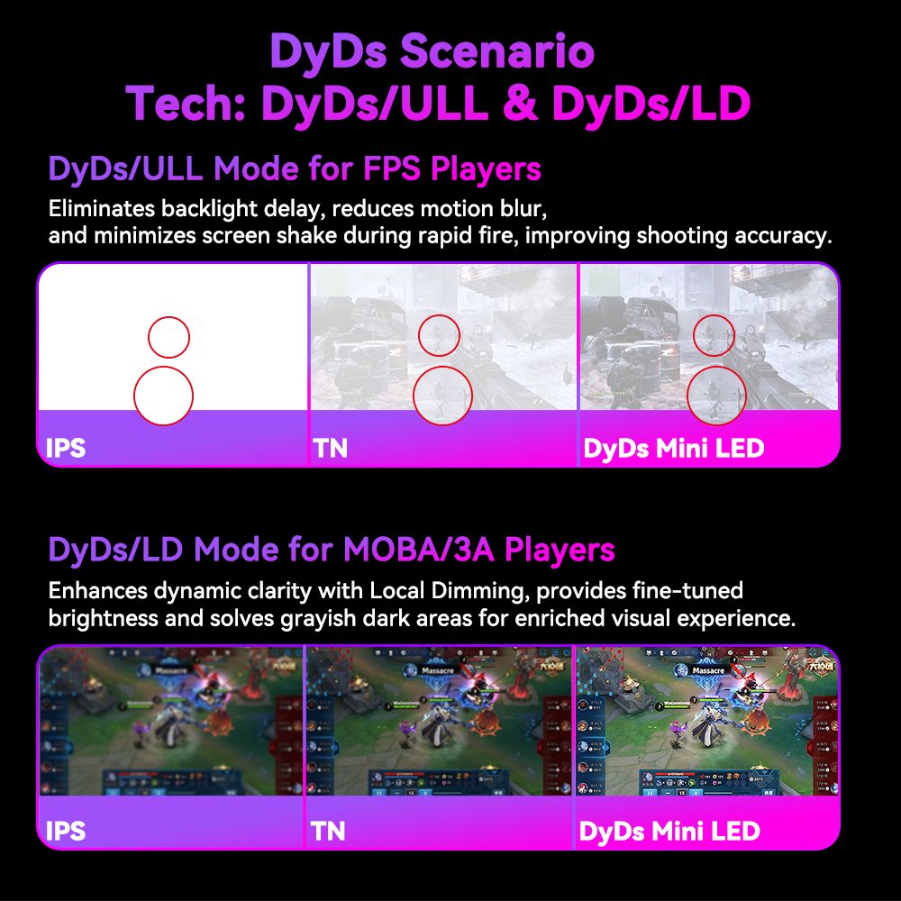 Points Forts Écran Mini LED Exclusif DyDs Utilisant des milliers de micropuces LED comme source de rétroéclairage et 1152 zones de gradation indépendantes, le panneau Mini LED contrôle et ajuste avec précision la luminosité en fonction du contenu à l'écran, offrant ainsi une uniformité et un contraste supérieurs. La technologie DyDs de TITAN ARMY améliore encore la clarté dynamique, la réactivité et la visibilité dans les scènes sombres en tirant parti de la précision matérielle du panneau Mini LED. De plus, avec l'outil logiciel TITAN Widget pour PC, vous pouvez ajuster facilement les paramètres du moniteur à l'aide de votre souris—éliminant ainsi le besoin de boutons physiques ou d'un joystick. Technologie de Scénario DyDs : DyDs/ULL & DyDs/LD Le moniteur intègre des modes de scénario DyDs/ULL et DyDs/LD. Le mode DyDs/ULL, optimisé pour les joueurs de FPS, améliore significativement la précision de tir en supprimant les tremblements d'écran et le flou de mouvement, vous aidant à verrouiller les cibles avec précision ; le mode DyDs/LD, conçu spécialement pour les joueurs de MOBA et de jeux 3A, optimise la courbe de luminosité et résout le problème des zones sombres grisâtres, rendant la hiérarchisation et l'expression des détails des scènes complexes plus exceptionnelles. Modes Double Résolution : 4K@160Hz/FHD@320Hz Il supporte la commutation en un clic entre les modes double résolution. Le mode ultra haute définition 3840×2160@160Hz apporte une expérience immersive avec chaque détail visible, tandis que le mode haute fréquence de rafraîchissement 1920×1080@320Hz conquiert les batailles rapides avec une réactivité extrême. Que ce soit pour les jeux 3A recherchant une haute qualité d'image, les esports compétitifs exigeant des opérations précises, ou la création de contenu quotidienne, le moniteur de jeu P275MV Plus peut instantanément correspondre aux paramètres optimaux. Couleurs Éclatantes & Luminosité HDR1000 Avec une précision de couleur ΔE<2, un volume de couleur de 153% sRGB, une couverture de 96% DCI-P3, une profondeur de couleur 8bit+FRC et 1,07 milliard de couleurs affichées, il atteint une reproduction de couleurs de niveau professionnel, rendant chaque image vive et naturelle avec des transitions fluides. Doté de la technologie HDR1000, la luminosité et le contraste dynamique sont grandement améliorés. Les zones claires ne sont pas surexposées, et les zones sombres conservent des détails, créant une expérience de jeu immersive de niveau cinéma. Synchronisation Adaptative & Protection des Yeux Améliorée La technologie Adaptive Sync synchronise la fréquence de rafraîchissement avec la sortie de la carte graphique, éliminant les déchirures d'écran et les saccades pour maintenir les scènes de jeu en mouvement fluides et stables. La technologie améliorée sans lumière bleue et sans scintillement soulage efficacement la fatigue oculaire lors des longues sessions de jeu, offrant une protection considérable pour vos yeux. 15 Modes de Scénario Intelligents & Affichage Double Hôte Prédéfini avec 15 modes de scénario, la commutation en un clic peut s'adapter à différents types de jeux (tels que FPS, RPG et MOBA) et scénarios d'utilisation (regarder des films, bureau, design), optimisant automatiquement les paramètres pour atteindre les meilleures performances. Il supporte les fonctions Picture-in-Picture (PIP) et Picture-by-Picture (PBP), permettant facilement l'affichage simultané de signaux double hôte, répondant aux besoins multitâches du jeu et du travail. Design Ergonomique & Éclairage RGB Ambiance Il offre des fonctions de réglage complètes : inclinaison réglable de -5°~20°, pivotement de -25° à +25°, rotation d'écran verticale de 90°, réglage de hauteur de 120mm et un trou de fixation VESA 100×100mm, s'adaptant facilement à différents environnements de bureau et habitudes d'utilisation. Les effets d'éclairage dynamique RGB intégrés changent la lumière et l'ombre au rythme du jeu, remplissant instantanément l'atmosphère esport. Interfaces Riches & Haut-parleurs Double Intégrés Disposant d'une gamme polyvalente de ports—incluant USB-A, USB-B, HDMI 2.1, Type-C et DP 1.4—ce moniteur se connecte facilement aux consoles de jeu, ordinateurs portables, périphériques et autres appareils, assurant une compatibilité transparente avec toute votre configuration. Les haut-parleurs double canaux intégrés fournissent des effets sonores clairs et pleins sans besoin de haut-parleurs supplémentaires, étendant l'immersion de jeu de la vision à l'audition.