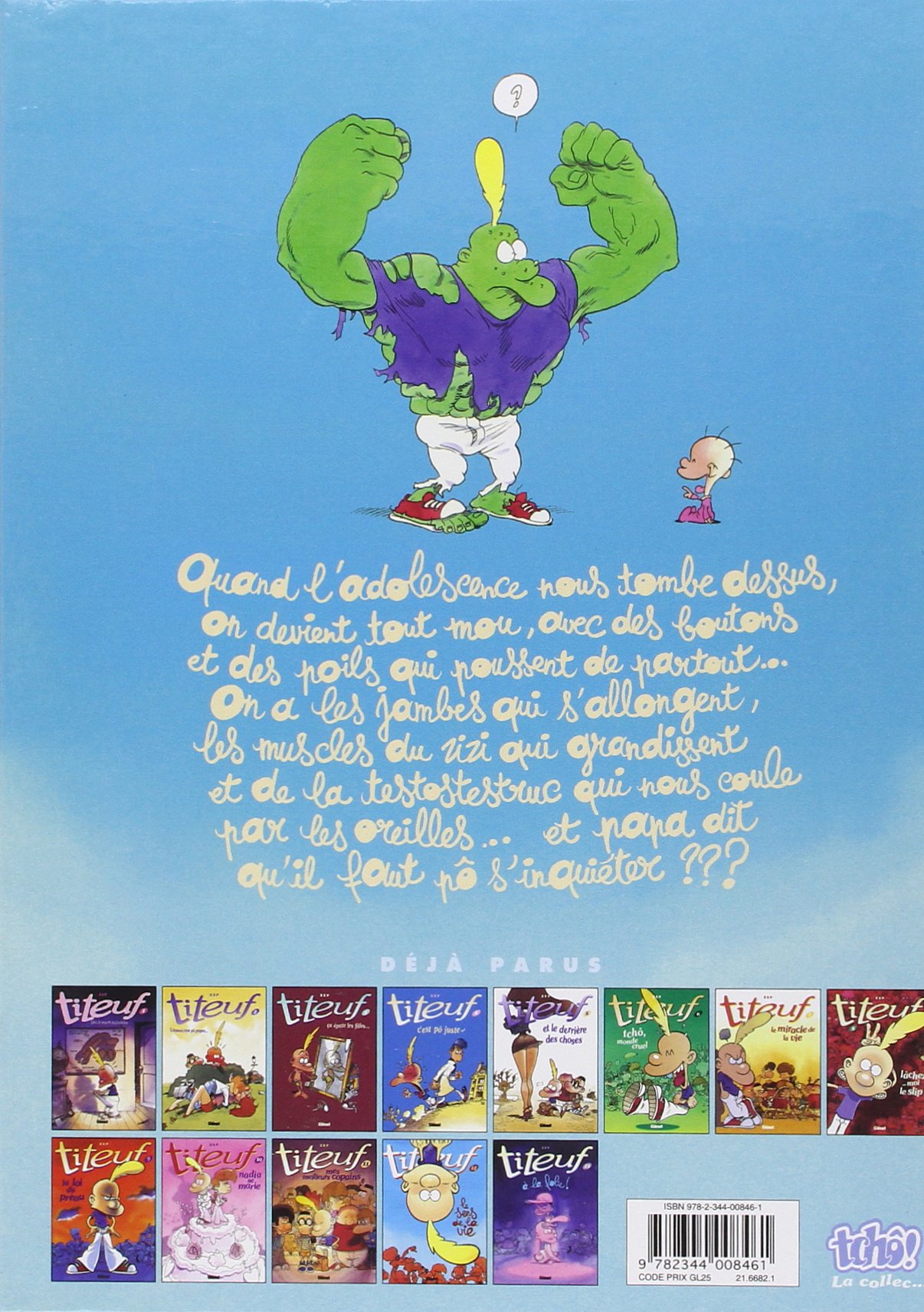 La vie de Titeuf est bien bousculée ! Lui qui avait jusqu’ici l’habitude de se prendre des baffes avec les filles doit maintenant choisir entre deux prétendantes : Nadia ou Ramatou. Une situation à s’arracher les cheveux ! À moins que... et s’il avait 2 amoureuses à mi-temps, comme fait le papa de François avec ses 2 emplois ? Mais il n’y a que les gamins pour penser à ce genre de solutions. Il est temps de grandir un peu, de passer à l’étape supérieure... l’adolescence : ce moment bizarre où l’on commence à embrasser les filles sur la bouche. Il paraît même qu’on a le corps qui se transforme... un peu comme Hulk, quoi ! Sauf que devenir ado, ça ne se commande pas. Un beau jour, ça vous tombe dessus, comme ça, sur le coin de la mèche ! Il doit quand même bien y avoir un moyen d’accélérer les choses, non ? Il n’existe pas des pilules pour ça ?...